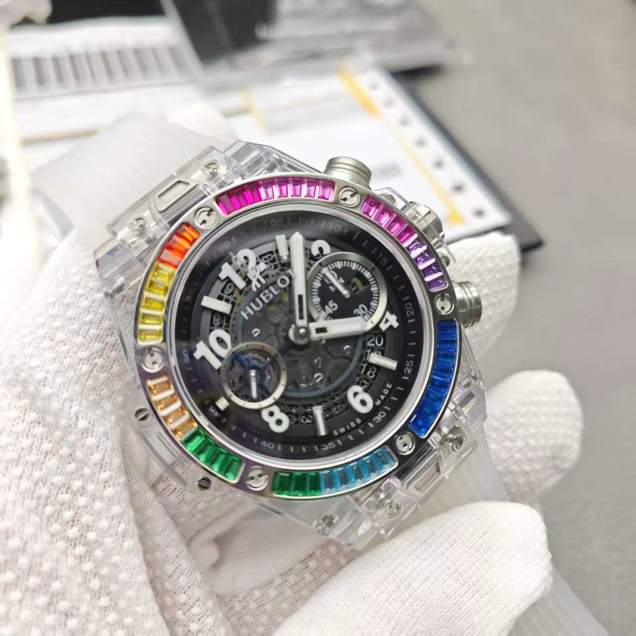 The Hublot Big Bang Unico Sapphire Rainbow 411.JX.4803.RT.4099 Replica is a luxury watch. It features a titanium case with a skeleton color and a gem-set bezel. The watch is powered by an automatic HUB1242 movement with a 60-hour power reserve and a precision of -3/+3 seconds per day within COSC certification limits. The dial is a skeleton color with mixed indices and 904L stainless steel stick hour markers and resin stick hands.