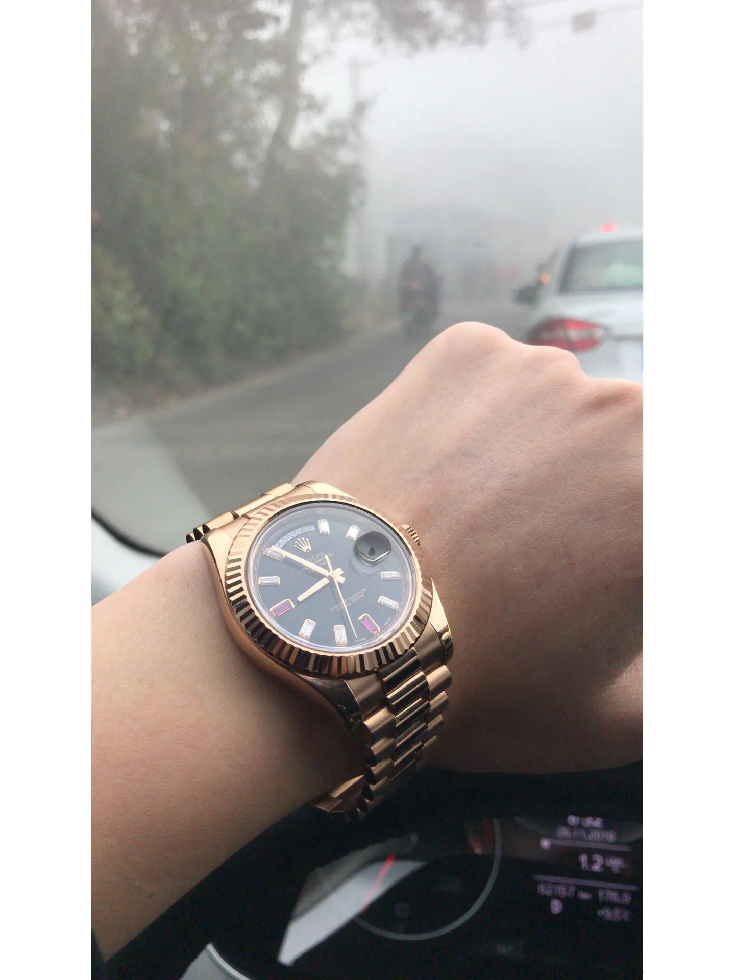 At the center is a visually captivating dial accented with gem-set hour markers, creating depth, contrast, and a high-jewelry aesthetic. The signature day display at 12 o’clock and date window at 3 o’clock, magnified by the Cyclops lens, remain perfectly balanced and instantly recognizable. This combination blends Rolex tradition with modern extravagance.