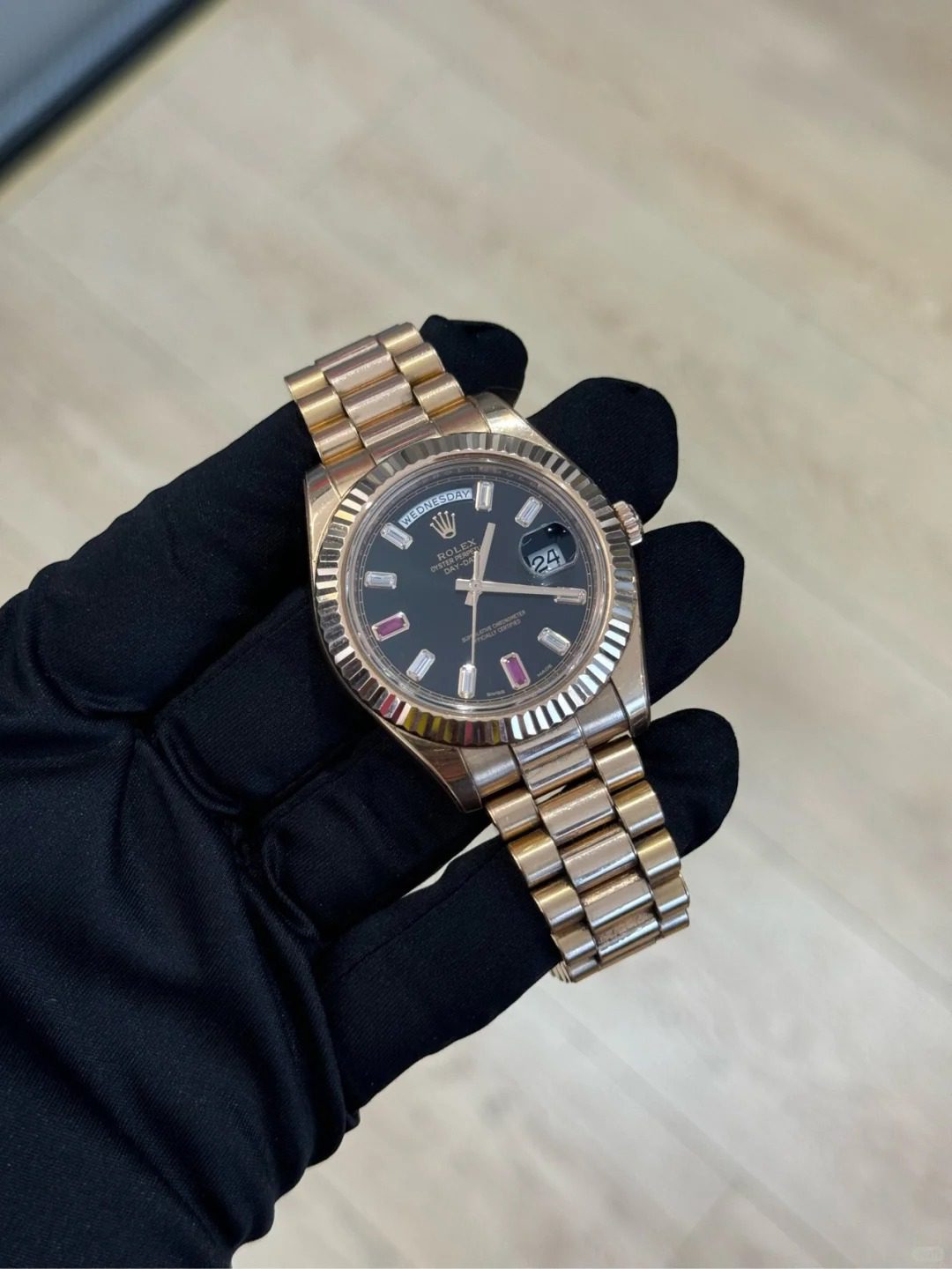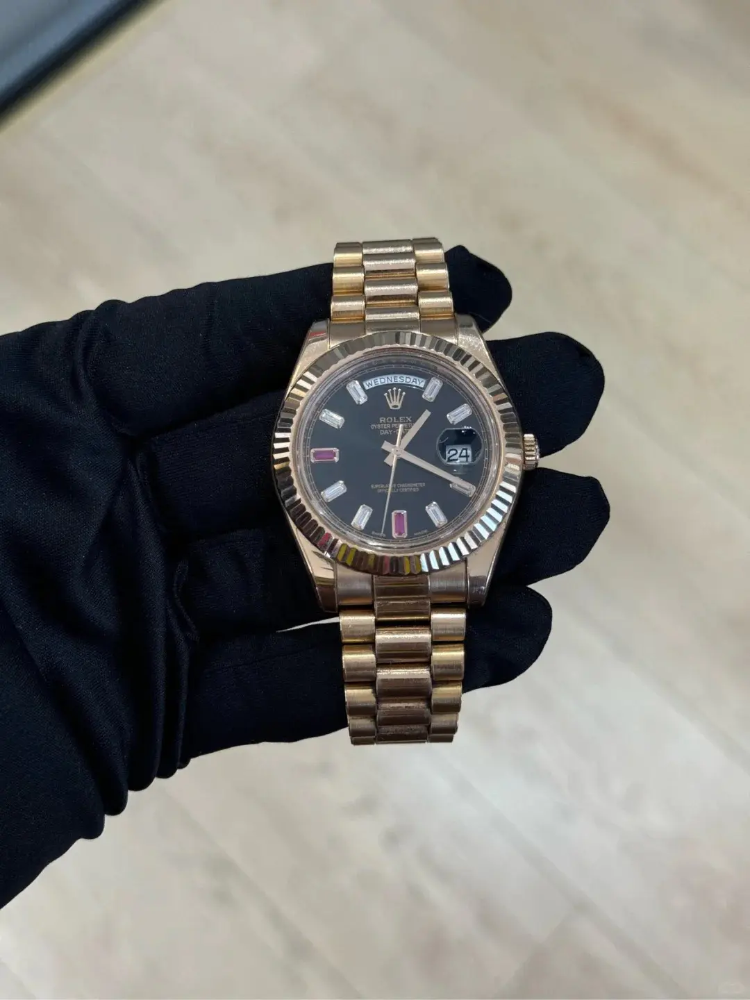 The 41mm case, finished in a warm rose-gold tone, delivers a powerful yet refined profile. Its polished surfaces and smooth bezel enhance the watch’s luxurious character while preserving the classic Day-Date silhouette. A scratch-resistant sapphire crystal protects the dial, ensuring lasting clarity and brilliance.