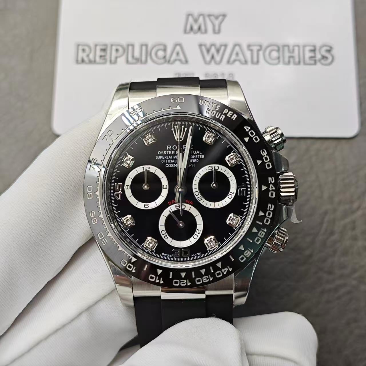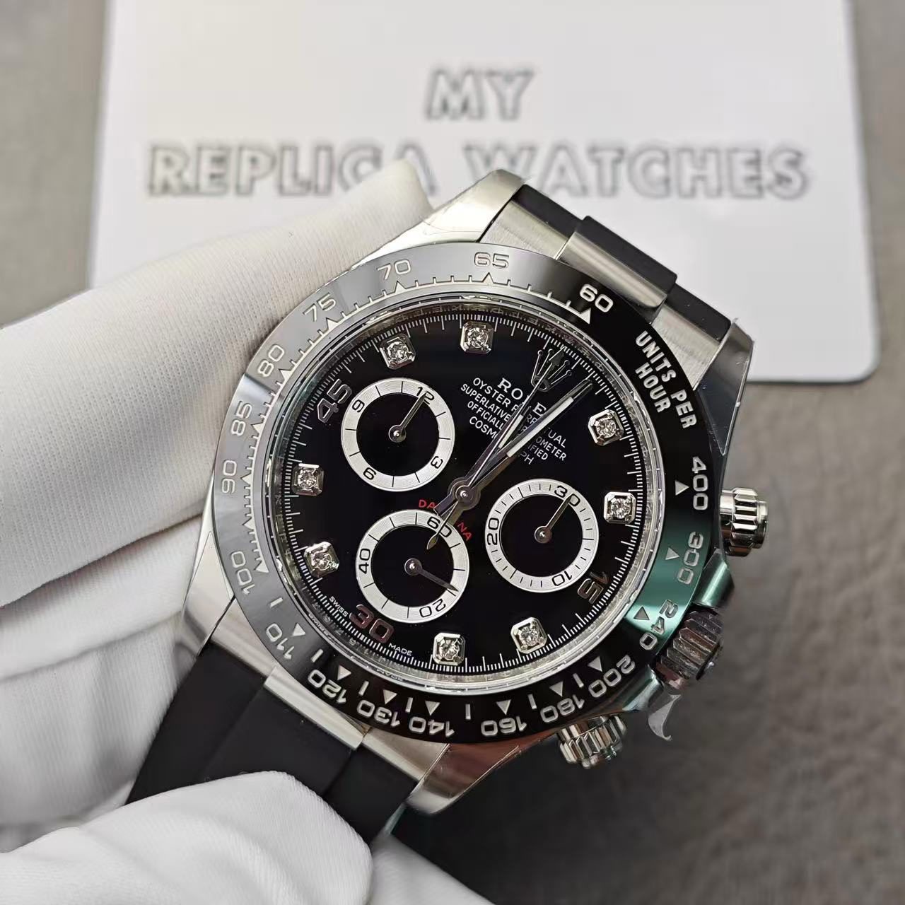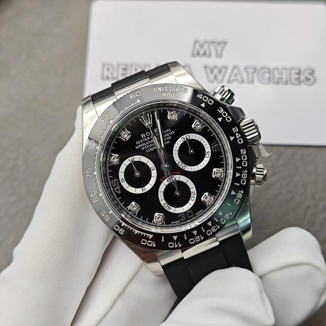 Replica Rolex Daytona Diamond Bezel White Gold Automatic Black Dial – Best Quality