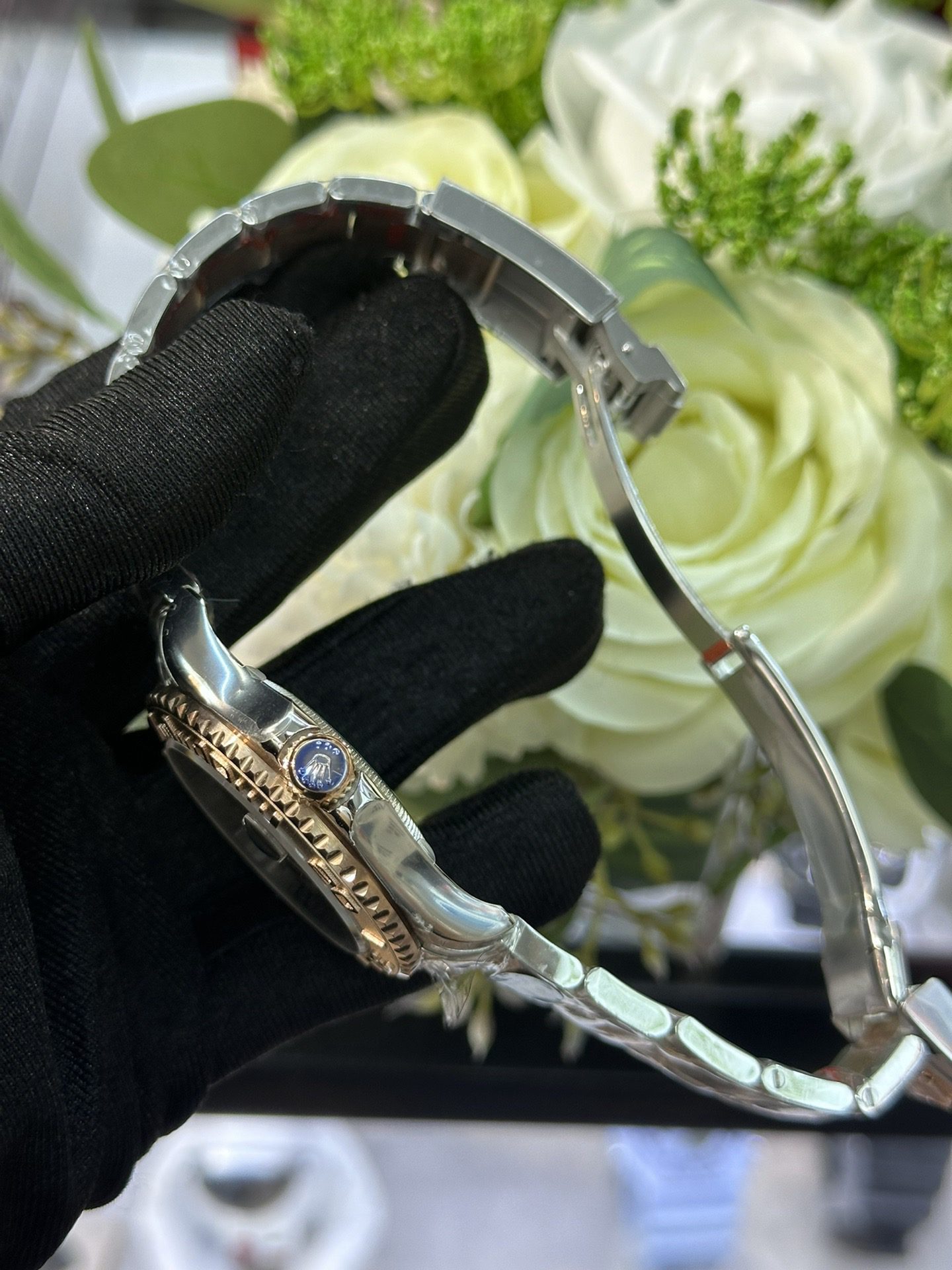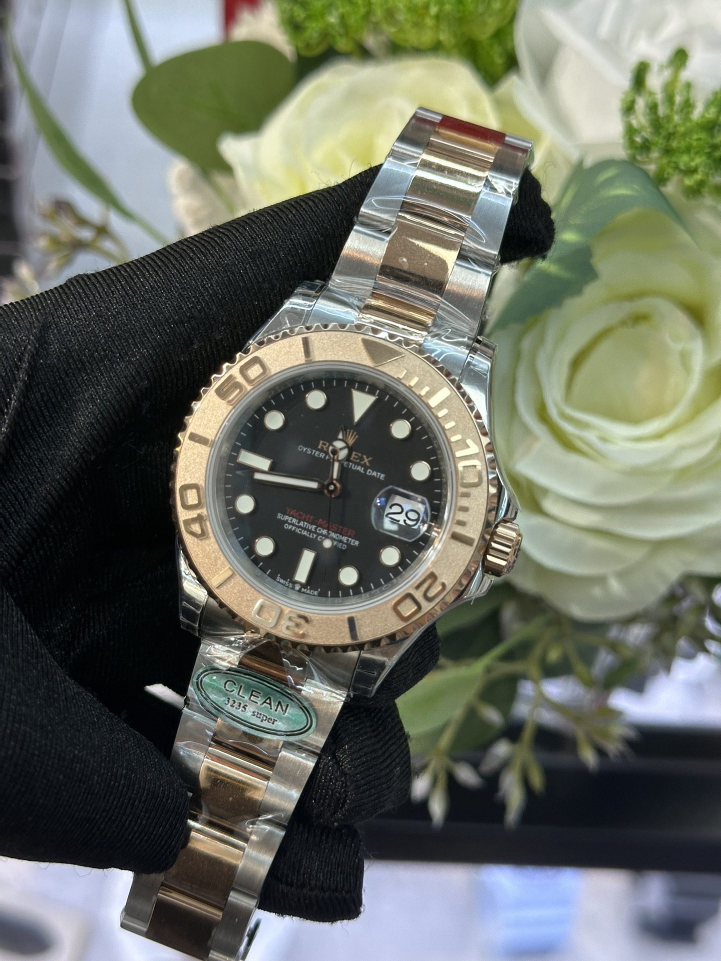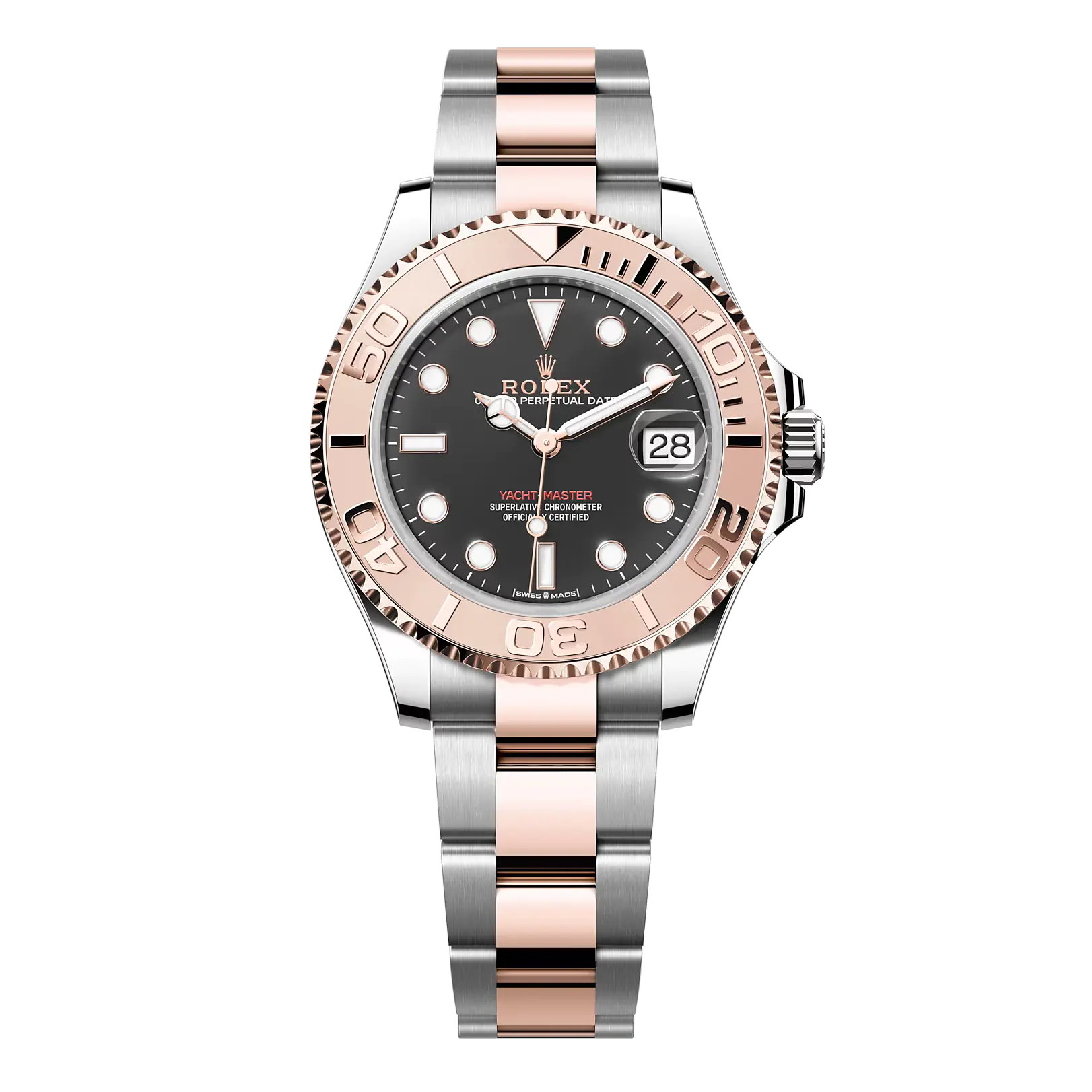 The Oyster-style case, finished in a rich Everose gold and stainless-steel two-tone aesthetic, delivers a balanced and contemporary wrist profile. Its signature bidirectional rotatable bezel with raised numerals adds both functionality and visual contrast, reinforcing the Yacht-Master’s maritime identity. A scratch-resistant sapphire crystal ensures long-lasting clarity and durability.