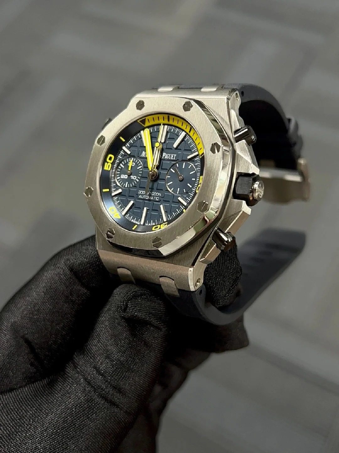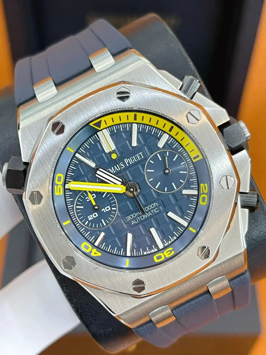 The Replica Swiss AP Royal Oak Offshore Diver Chronograph delivers a powerful combination of professional dive-watch functionality and bold luxury sports styling. Built on the unmistakable Offshore platform, this model merges chronograph performance with the rugged character and commanding presence that define the Royal Oak Offshore line.