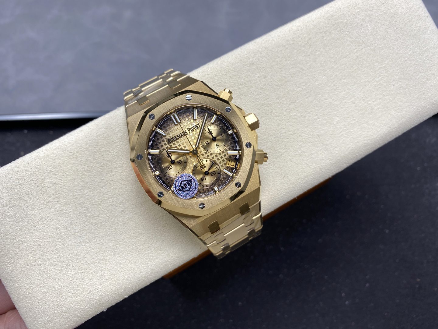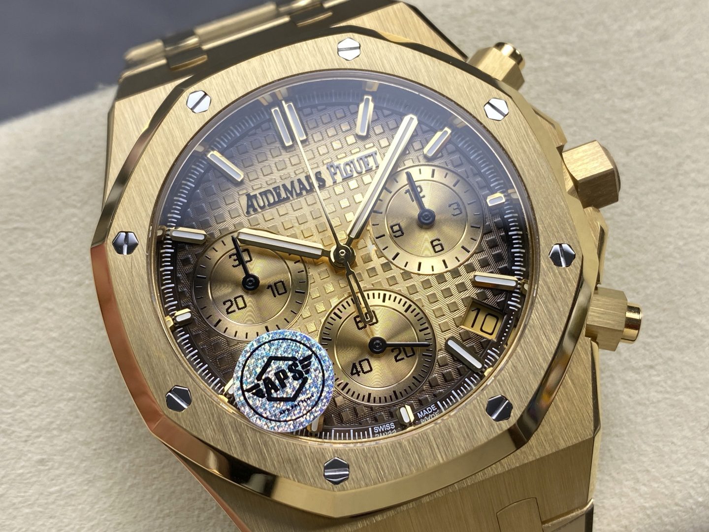 The Replica Swiss Audemars Piguet Royal Oak Chronograph Yellow Gold & Smoked Champagne Dial 41mm delivers a bold expression of luxury paired with the unmistakable Royal Oak design language. The rich yellow gold finish is perfectly complemented by the smoked champagne “Grande Tapisserie” style dial, creating a warm, refined aesthetic that stands out with confidence and elegance.