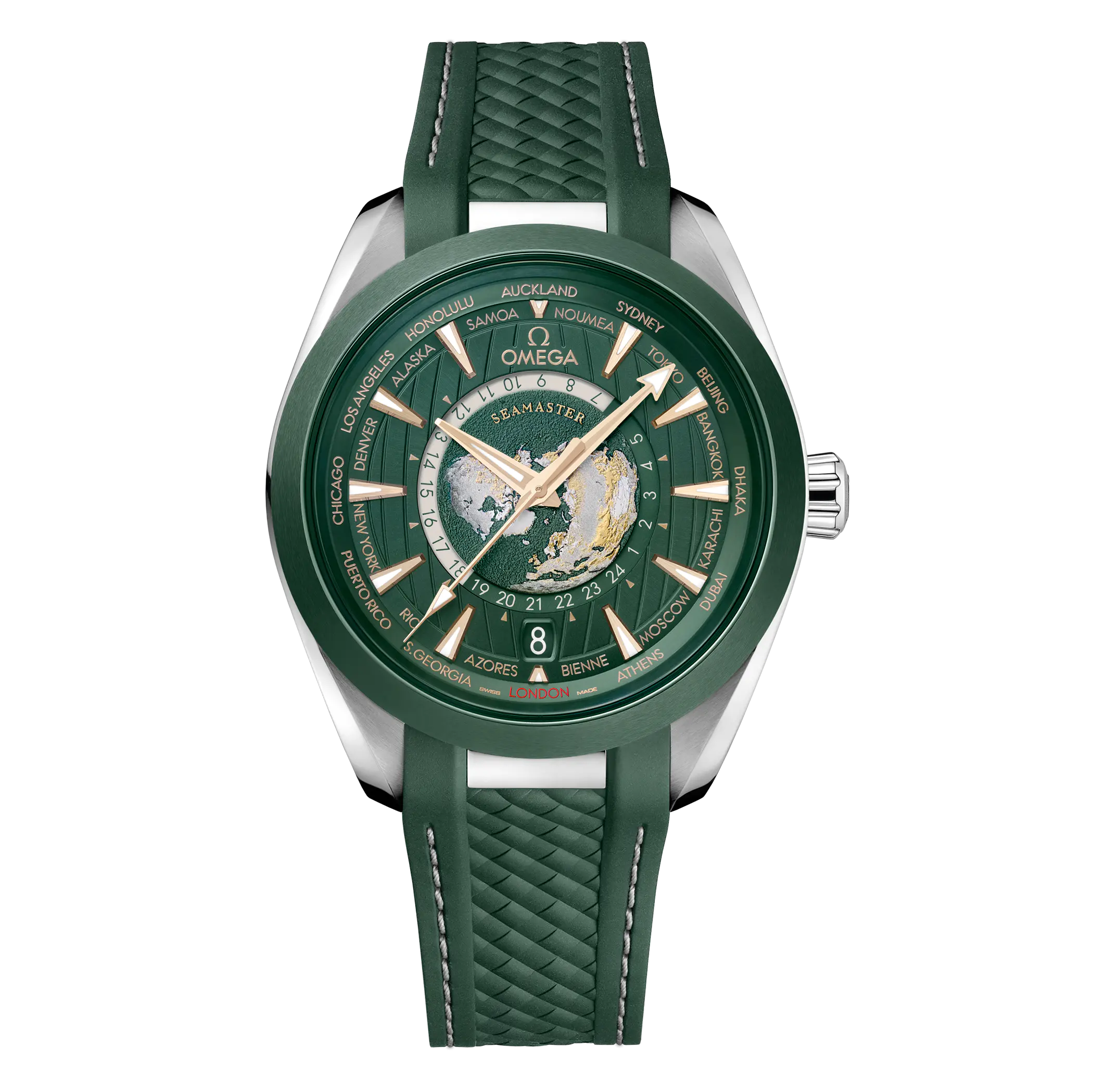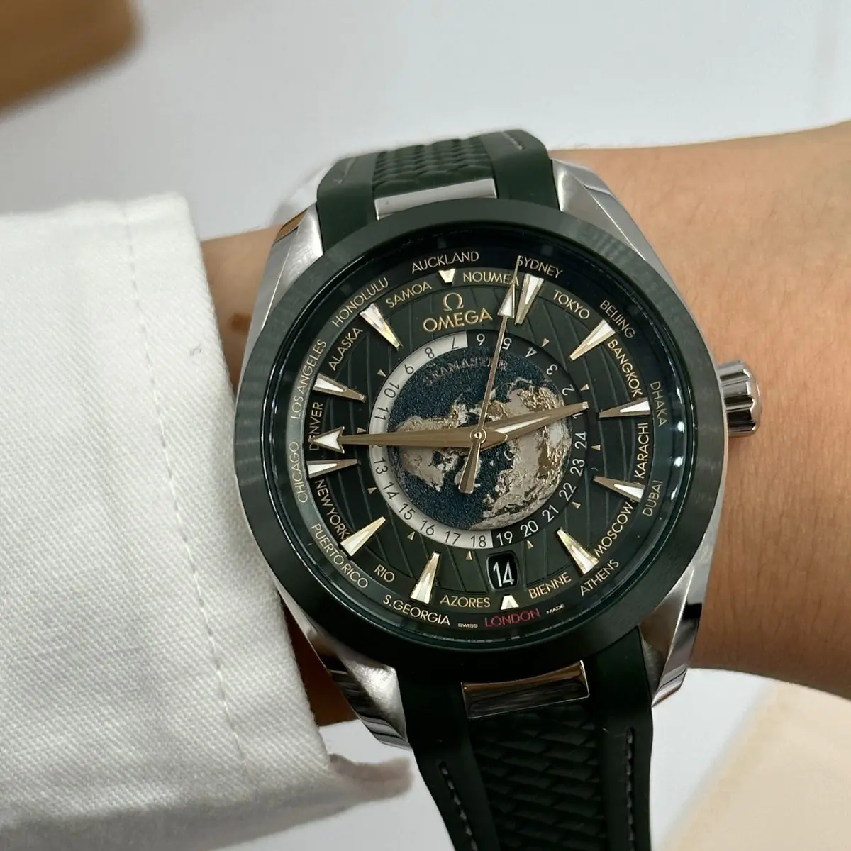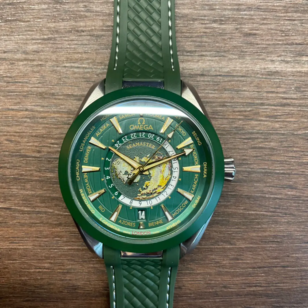 The Replica Swiss Omega Seamaster Worldtimer GMT 43mm Green Dial delivers a striking blend of advanced world-time functionality and bold modern design. The rich green dial adds depth and character to the intricate worldtimer layout, creating a timepiece that stands out while remaining refined and highly legible.