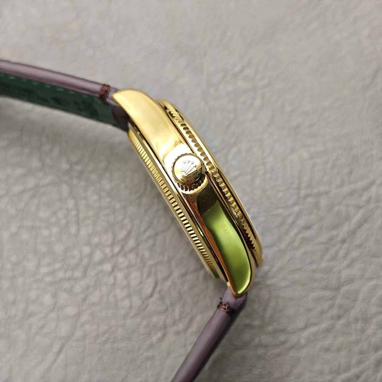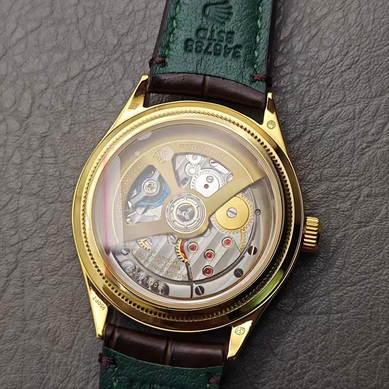 El reloj lleva una correa de piel de aligátor en marrón mate o negro mate, con forro verde y pespuntes tono sobre tono.