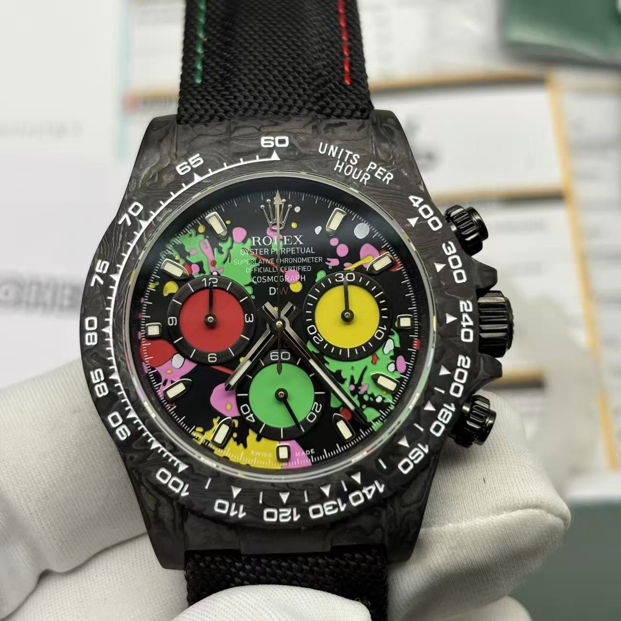 High-end customized special edition Rolex Daytona carbon fiber material, 4130 full-function chronograph mechanical movement Daytona, colorful graffiti personalized surface design, black cloth strap, 40mm sports casual men’s watch.