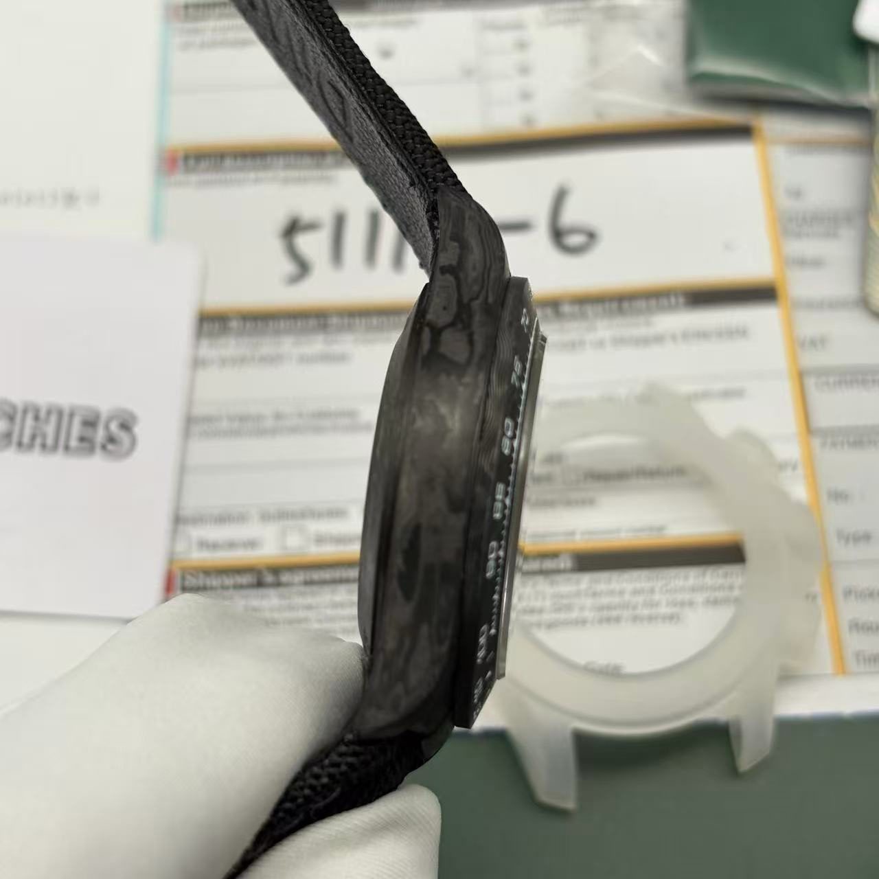 [Case] Made of carbon fiber, it is light and comfortable to wear. Each watch has a unique carbon fiber pattern. Because carbon fiber is very hard, the case will suffer a lot of wear and tear during the CNC molding process!