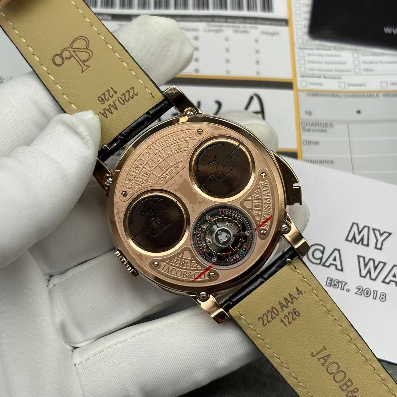 The Jacob & Co. Casino Tourbillon Baguette Rose Gold Super Clone is a watch like no other — blending horology, luxury, and entertainment in a single stunning piece. This 1:1 Swiss-grade replica captures the thrilling style and complexity of the real Jacob & Co. Casino watch, including the fully functional roulette wheel at its core.