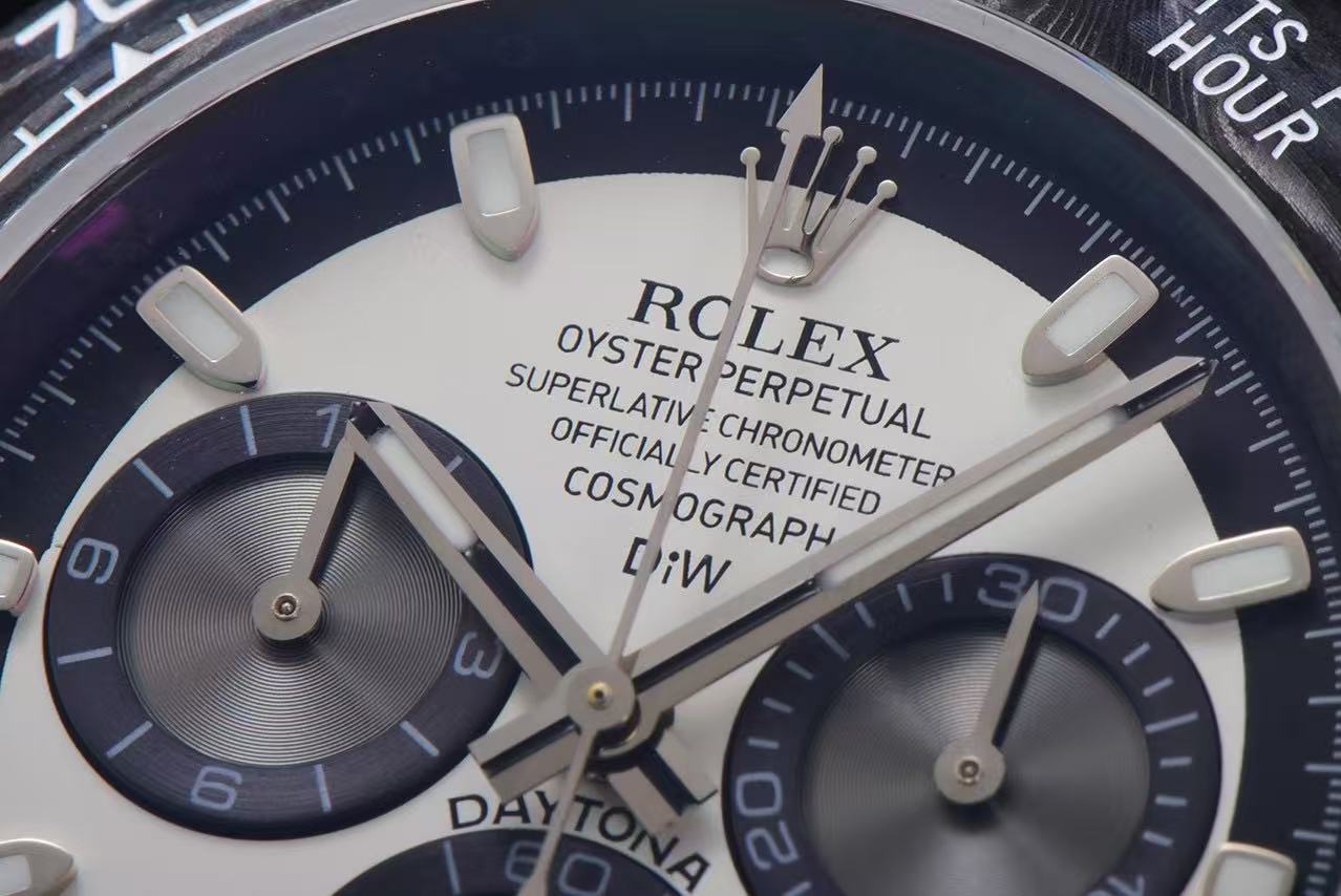 The Replica DiW Rolex Cosmograph Daytona Cream Edition Carbon delivers an extraordinary fusion of Rolex’s timeless racing heritage and DiW’s contemporary carbon-fiber innovation. Designed for the modern enthusiast, this exclusive model features a lightweight forged carbon case paired with a creamy beige dial, offering a sophisticated yet sporty visual contrast rarely seen in traditional Daytona designs.