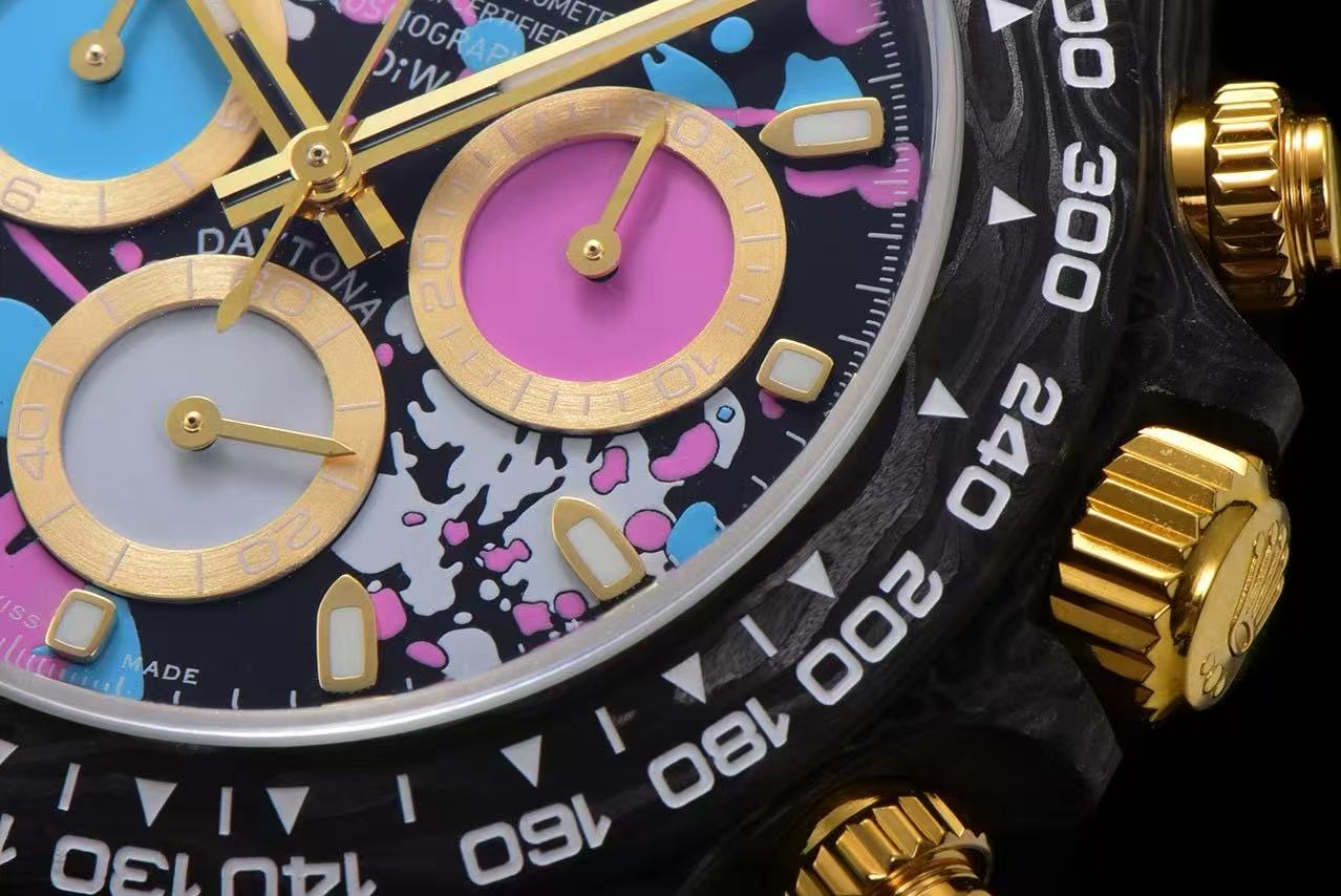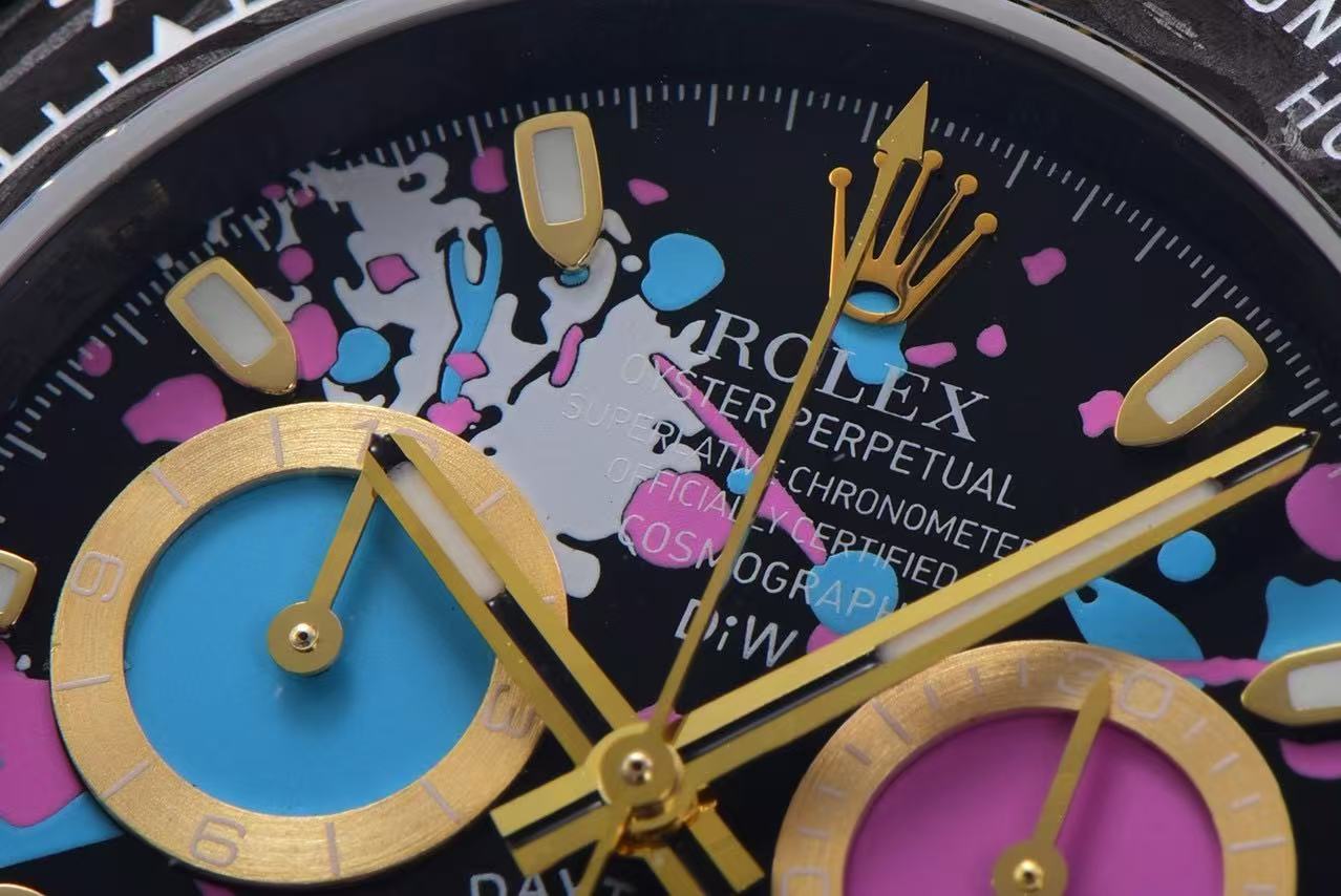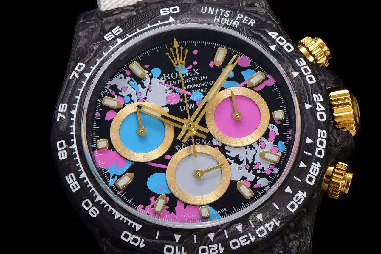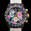 The Replica DiW Rolex Cosmograph Daytona Motley 3S Carbon stands as one of the most daring and artful reinterpretations of the legendary Daytona — a masterpiece where modern performance meets bold individuality. Crafted from forged carbon, this special edition boasts DiW’s signature “Motley” pattern, a fusion of black, grey, and subtle multicolor carbon layers, giving each piece a completely unique and unrepeatable texture.