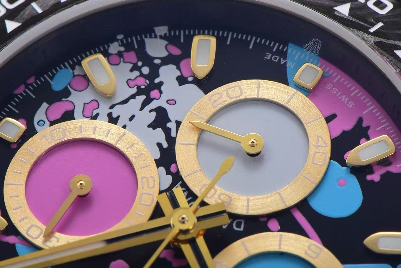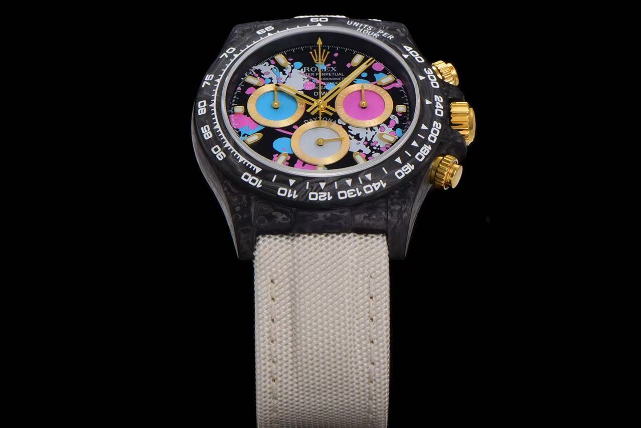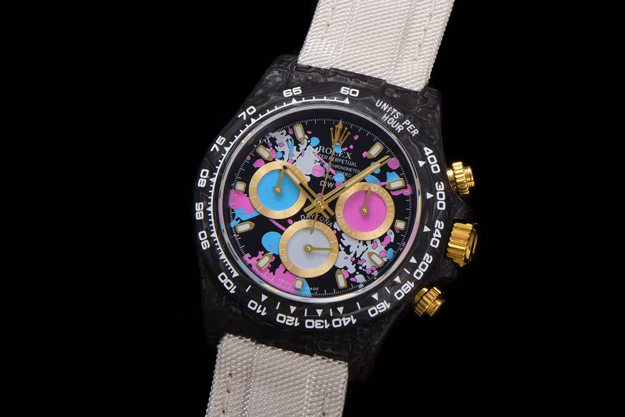 The Replica DiW Rolex Cosmograph Daytona Motley 3S Carbon stands as one of the most daring and artful reinterpretations of the legendary Daytona — a masterpiece where modern performance meets bold individuality. Crafted from forged carbon, this special edition boasts DiW’s signature “Motley” pattern, a fusion of black, grey, and subtle multicolor carbon layers, giving each piece a completely unique and unrepeatable texture.
