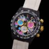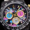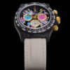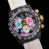 Measuring 40mm, the forged carbon case pairs lightweight durability with unmatched visual depth. Its carbon tachymeter bezel and motorsport-inspired dial echo the Daytona’s racing DNA while adding DiW’s signature creative flair. The black dial is accented with vivid, multi-toned subdials and markers that create a vibrant yet balanced aesthetic — a modern homage to individuality, craftsmanship, and speed.