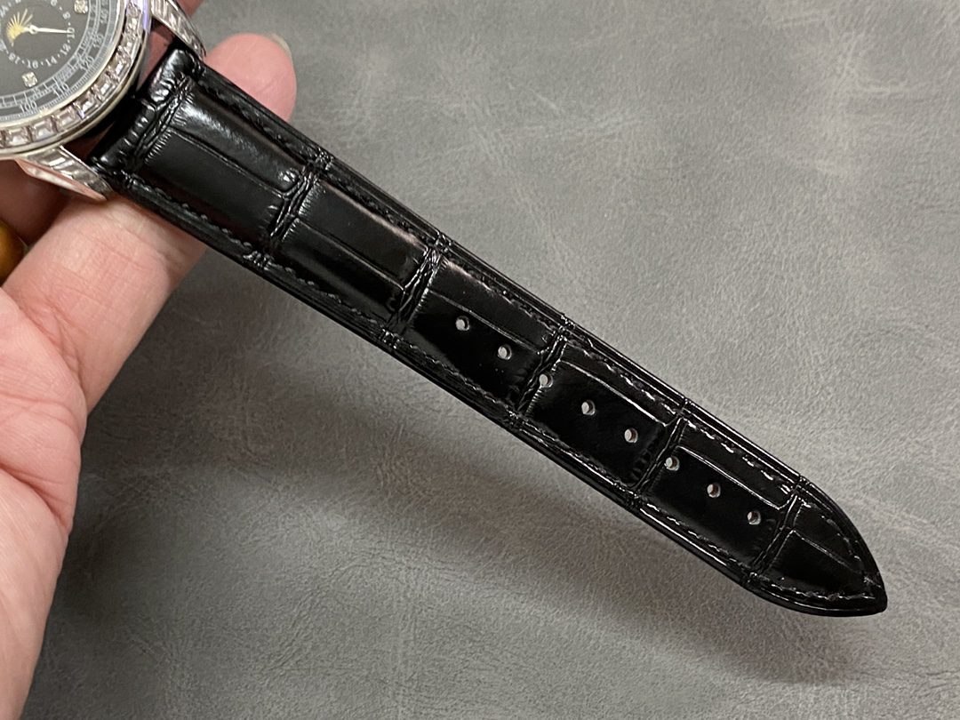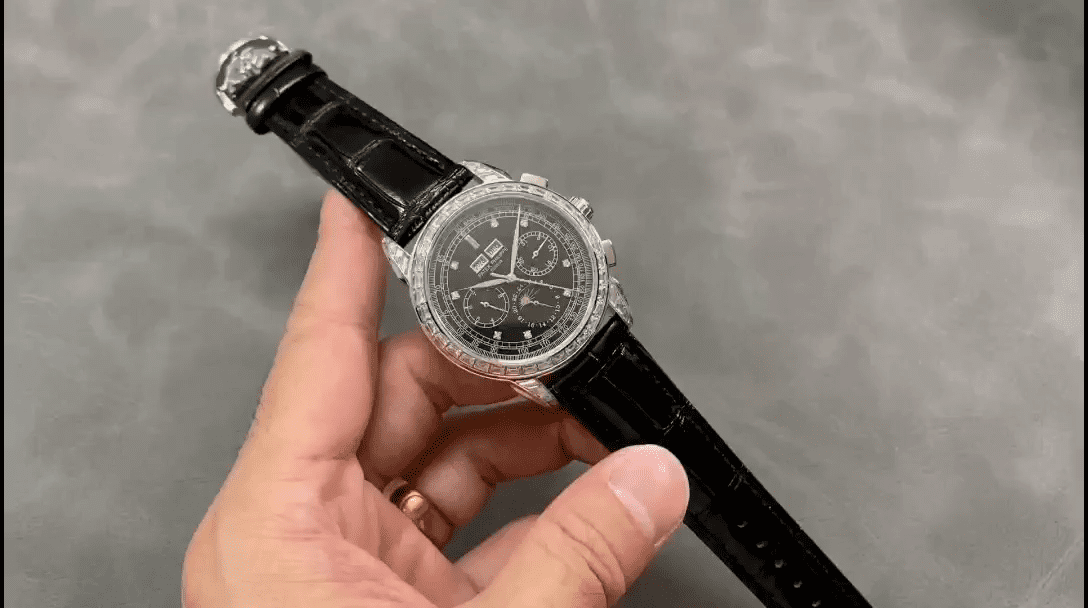 The 41mm platinum-inspired case delivers a sophisticated metallic sheen while maintaining a slim, graceful profile. Its polished surfaces and elegant stepped design reflect Patek Philippe’s classic Grand Complications craftsmanship. A secure screw-down crown and premium case finishing give the watch both durability and prestige.