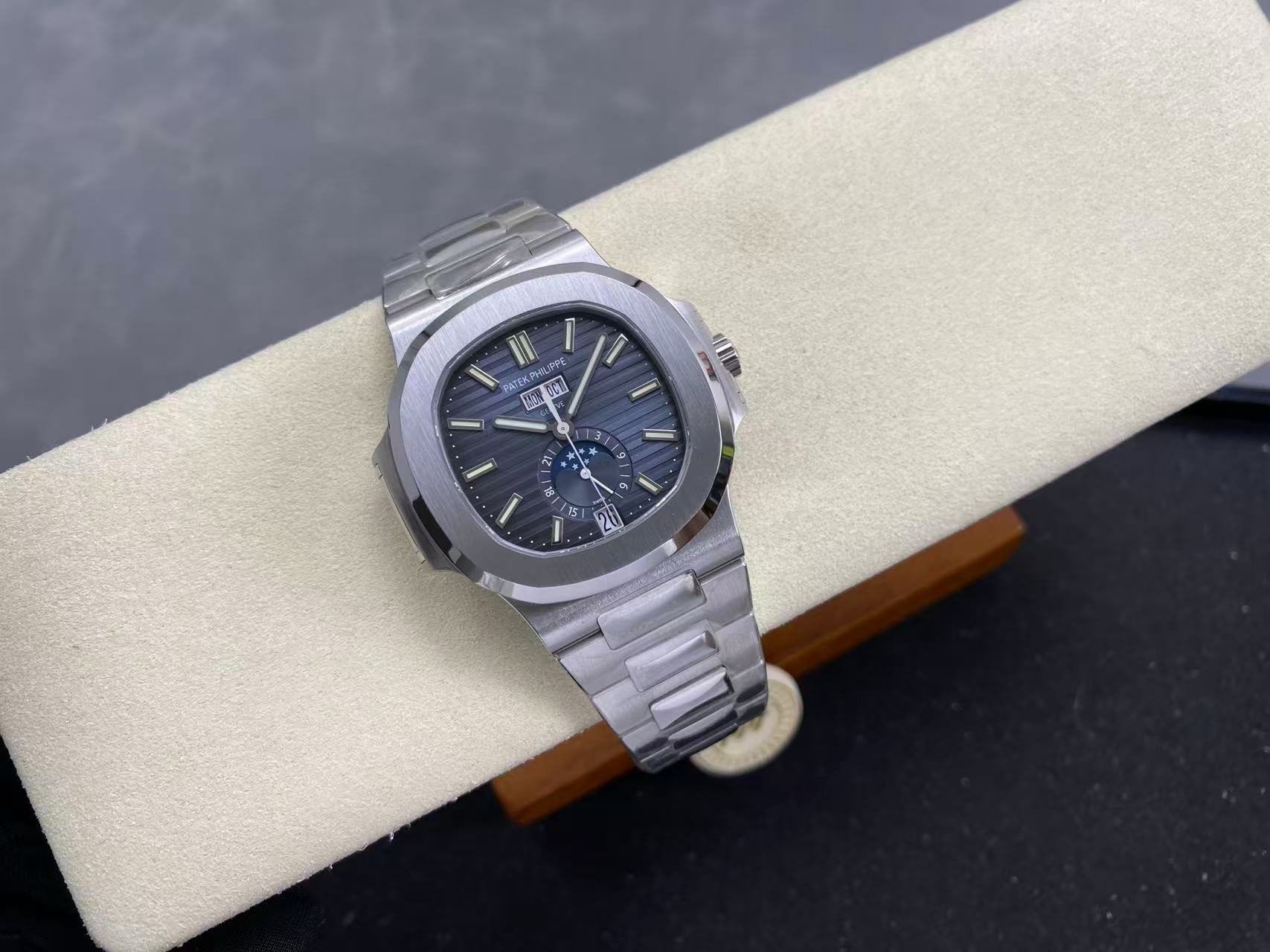 The Replica Patek Philippe 5726 Blue Calendar Watch is a 1:1 super clone of one of the most admired pieces in the Nautilus line. It combines the signature porthole-style case, a deep blue dial, and full annual calendar functionality — all reproduced in a clean, wearable replica.