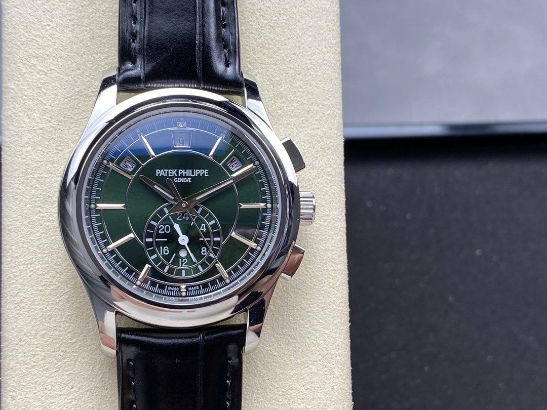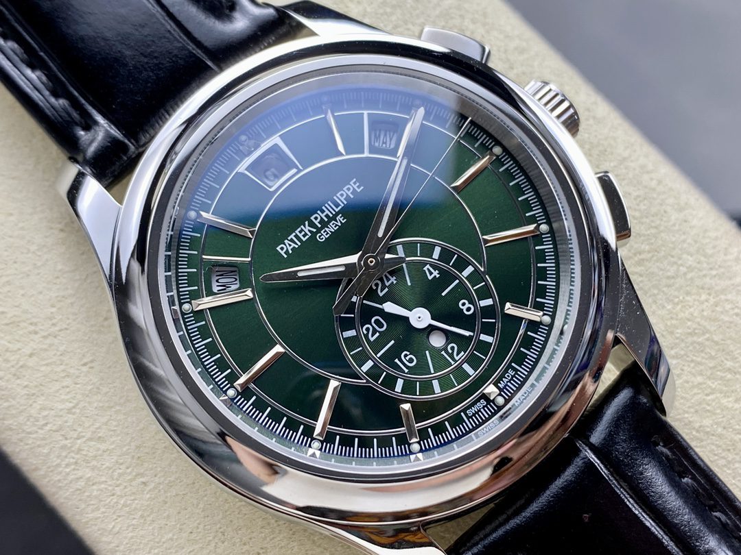 The standout feature is the mesmerizing green sunburst dial (5905P-014’s signature color), shifting from deep emerald to lighter shades as it catches the light. The dial hosts Patek’s elegant layout: