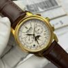 The 40mm yellow-gold case features sculpted lugs, polished contours, and the perfect proportions that made the 5970 one of the most admired perpetual calendar chronographs ever produced. The premium leather strap pairs naturally with the warm gold tones, making this piece ideal for collectors who appreciate tradition elevated by luxury.