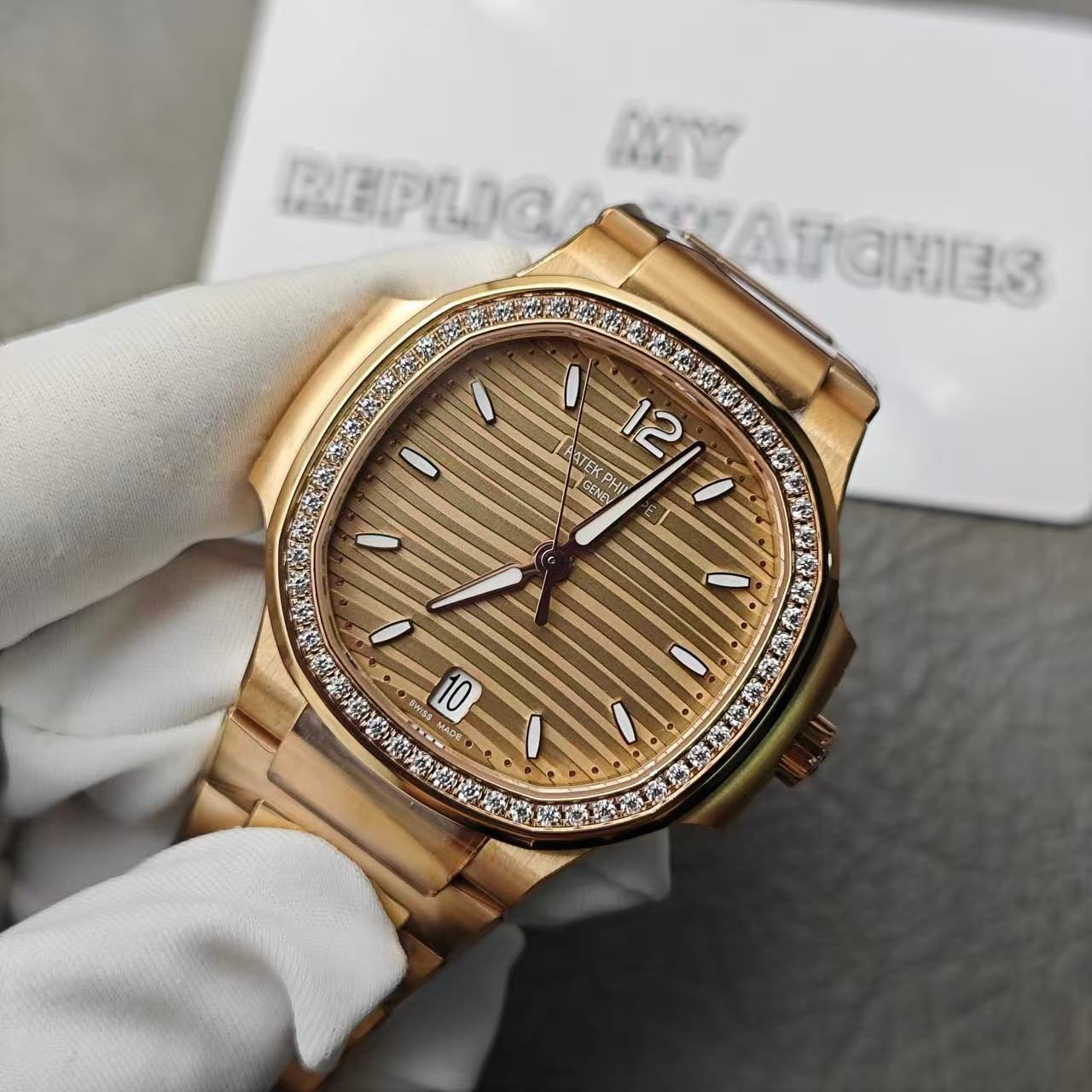 Limited Stock Alert: Only a few units of the Replica Patek Philippe Ladies Nautilus 7118/1200R-010 (Golden Dial, Rose Gold) remain. This model is among the most sought-after women’s luxury watches, and restocking is highly unpredictable.