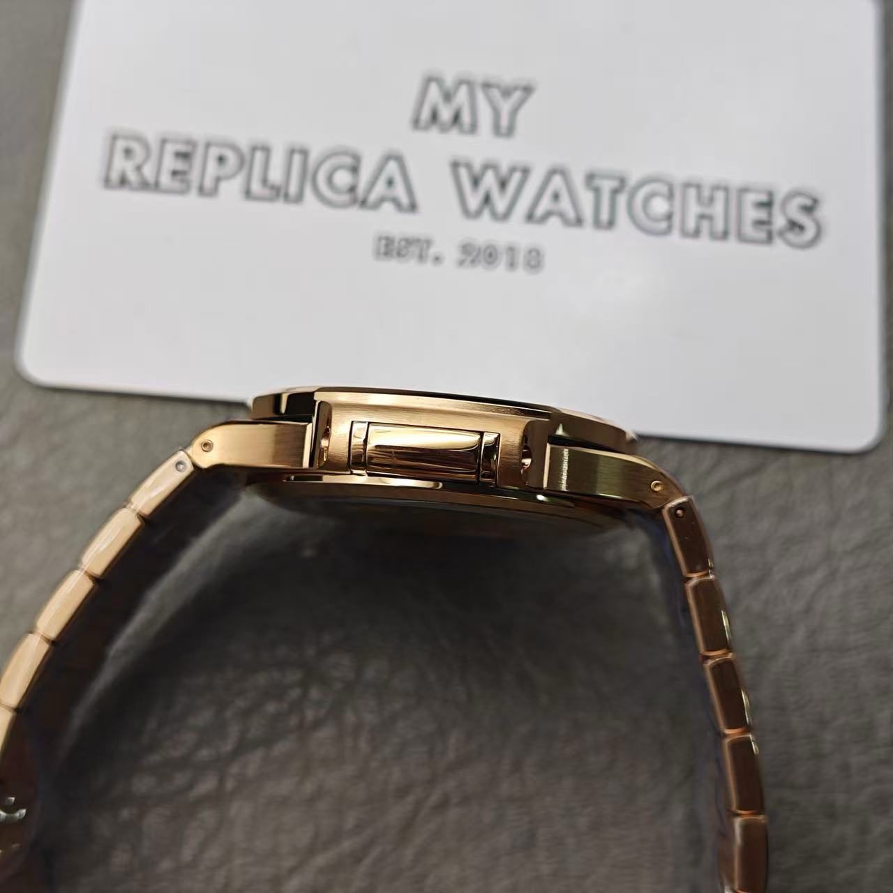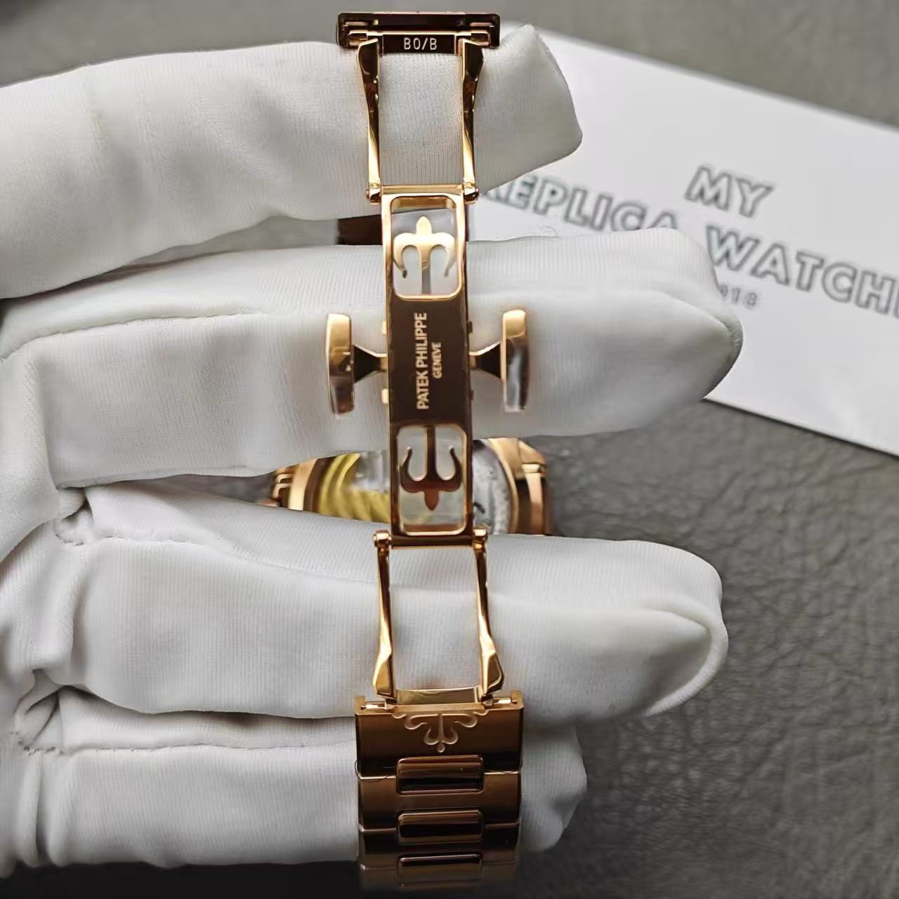 The rose gold case and integrated bracelet reflect exquisite finishing with alternating polished and satin-brushed surfaces, giving the watch a radiant glow and premium wrist presence. Its classic rounded-octagonal bezel stays true to the Nautilus identity, while the bracelet’s smooth articulation ensures comfort and sophistication for daily wear or special occasions.