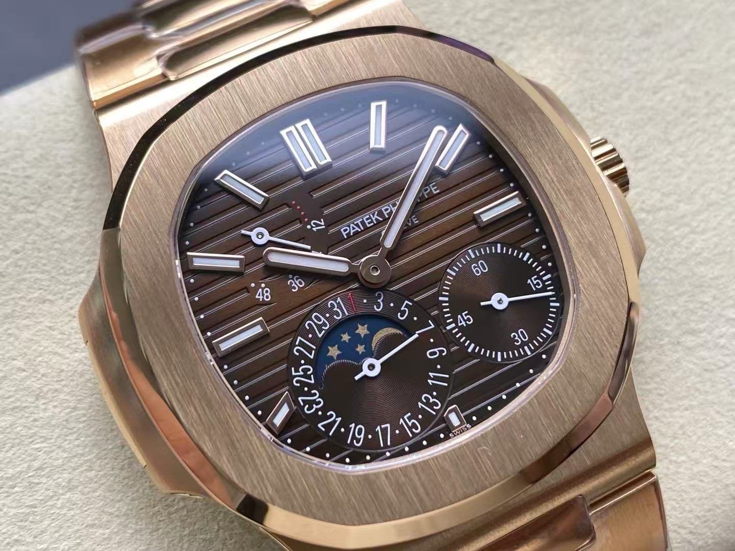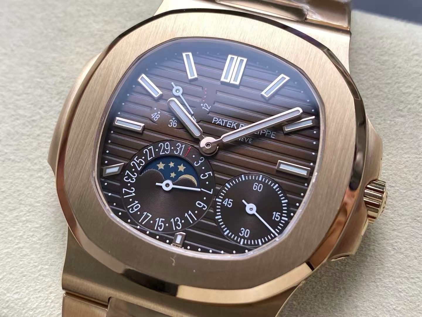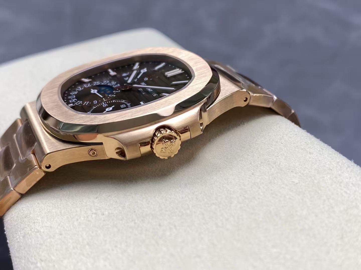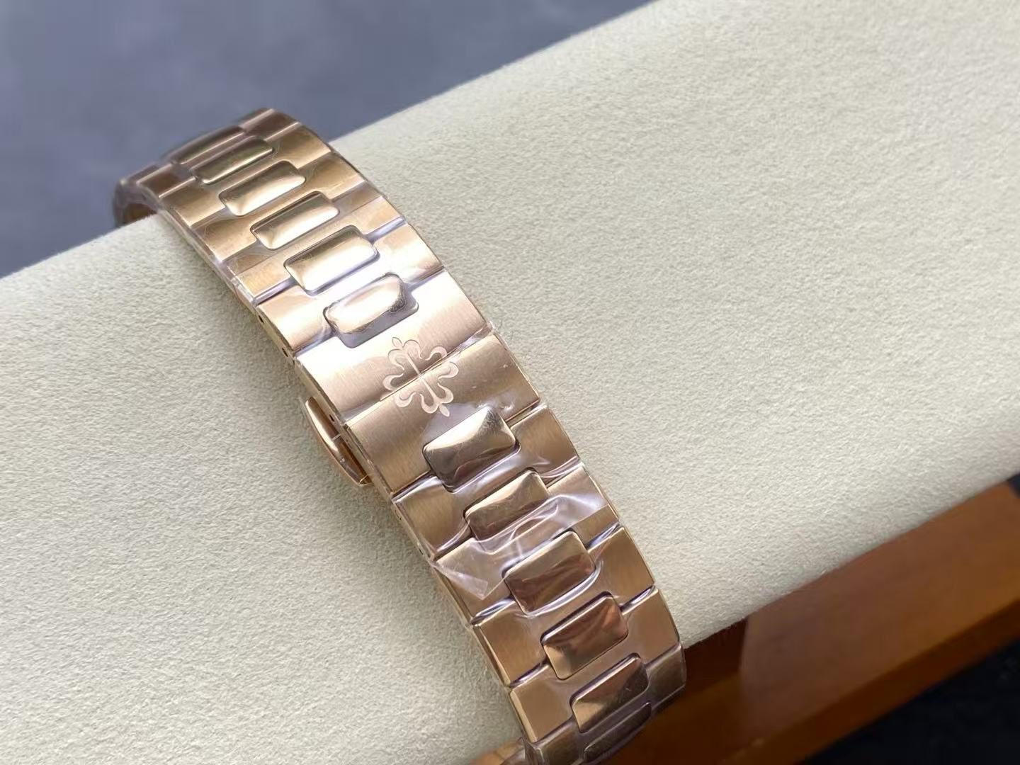 The 40mm rose gold case showcases the signature rounded-octagonal Nautilus bezel, beautifully brushed and polished to replicate the iconic Patek DNA. The integrated rose-gold bracelet flows seamlessly into the case, offering exceptional comfort and timeless style.