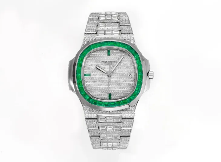 The Replica Swiss Patek Philippe Nautilus Platinum Green Diamond 40mm delivers an extraordinary blend of high jewelry craftsmanship and iconic watch design. Inspired by one of the most exclusive Nautilus variations, this model features a striking green dial accented by emerald-style detailing and a fully diamond-set case and bracelet, creating a bold and unmistakable presence.