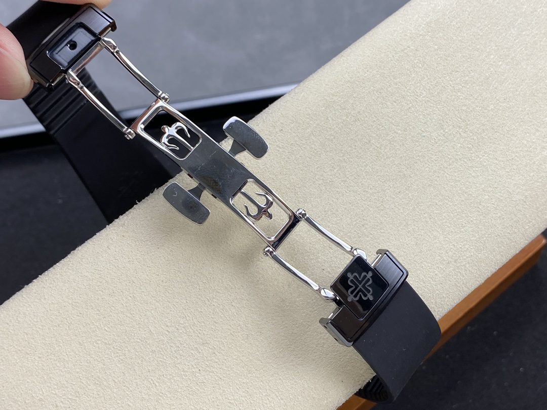 The 40mm fiber case offers a durable yet lightweight construction while maintaining the Nautilus’ signature rounded-octagonal silhouette. With polished contours, a slim profile, and a screw-down crown, this piece blends toughness with understated elegance — perfect for daily wear.