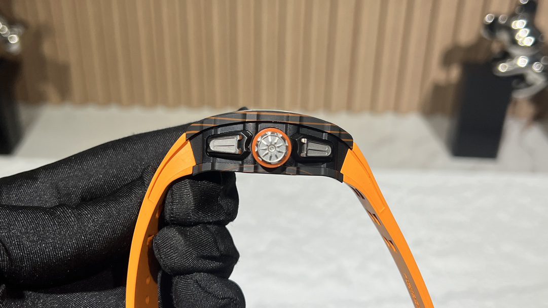 Authentic Aesthetics – Precisely mirrors the RM 11-03 McLaren’s design with carbon fiber case and orange racing details