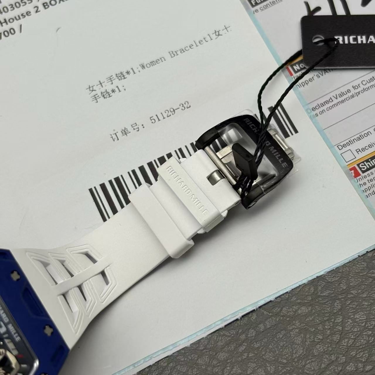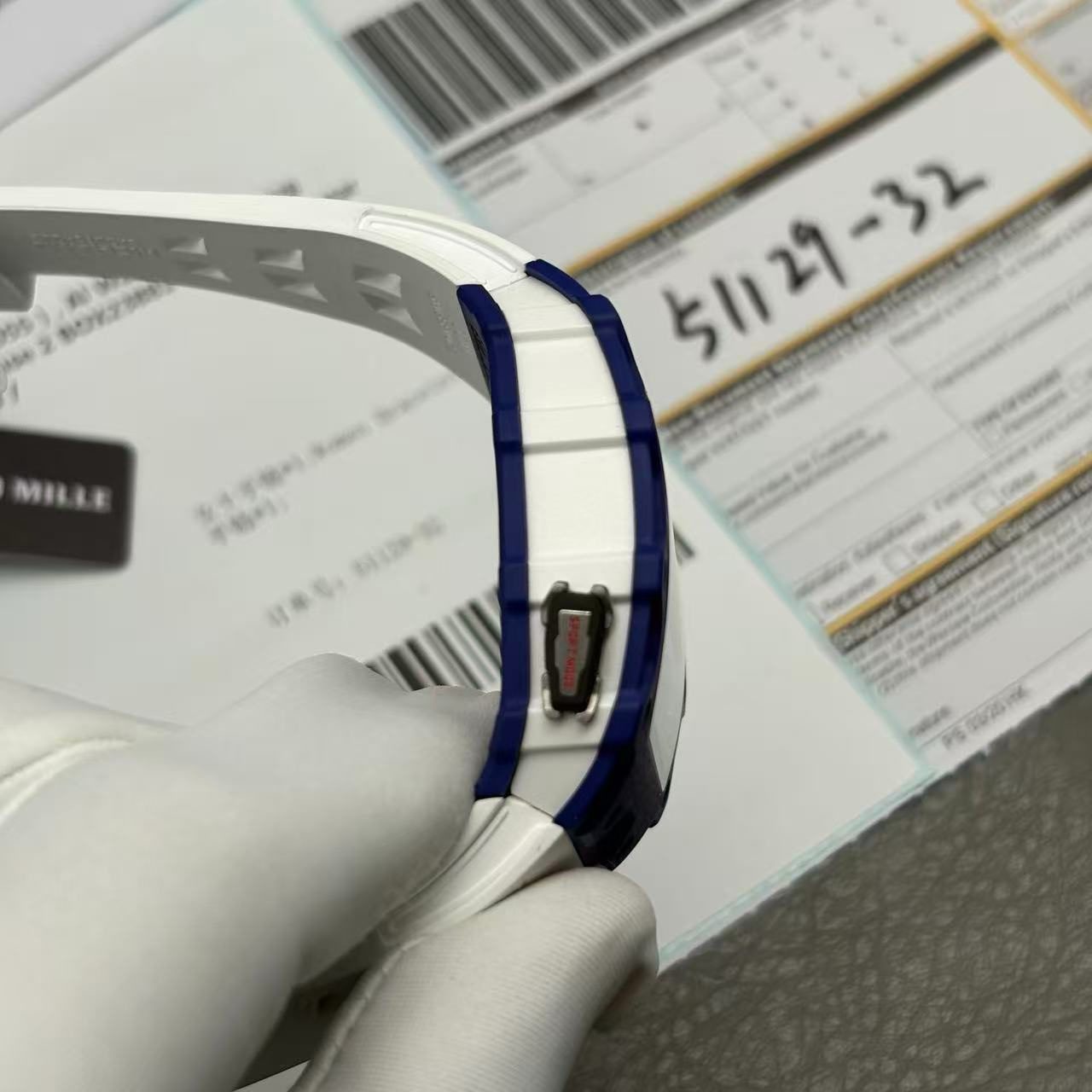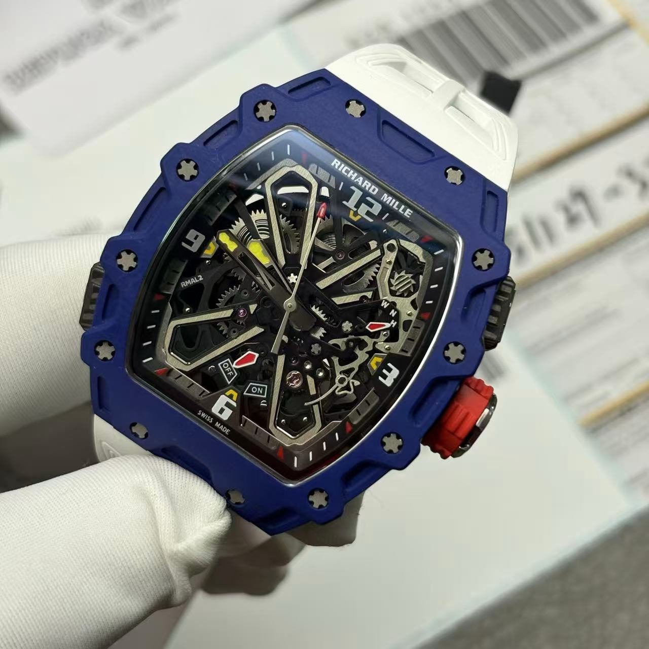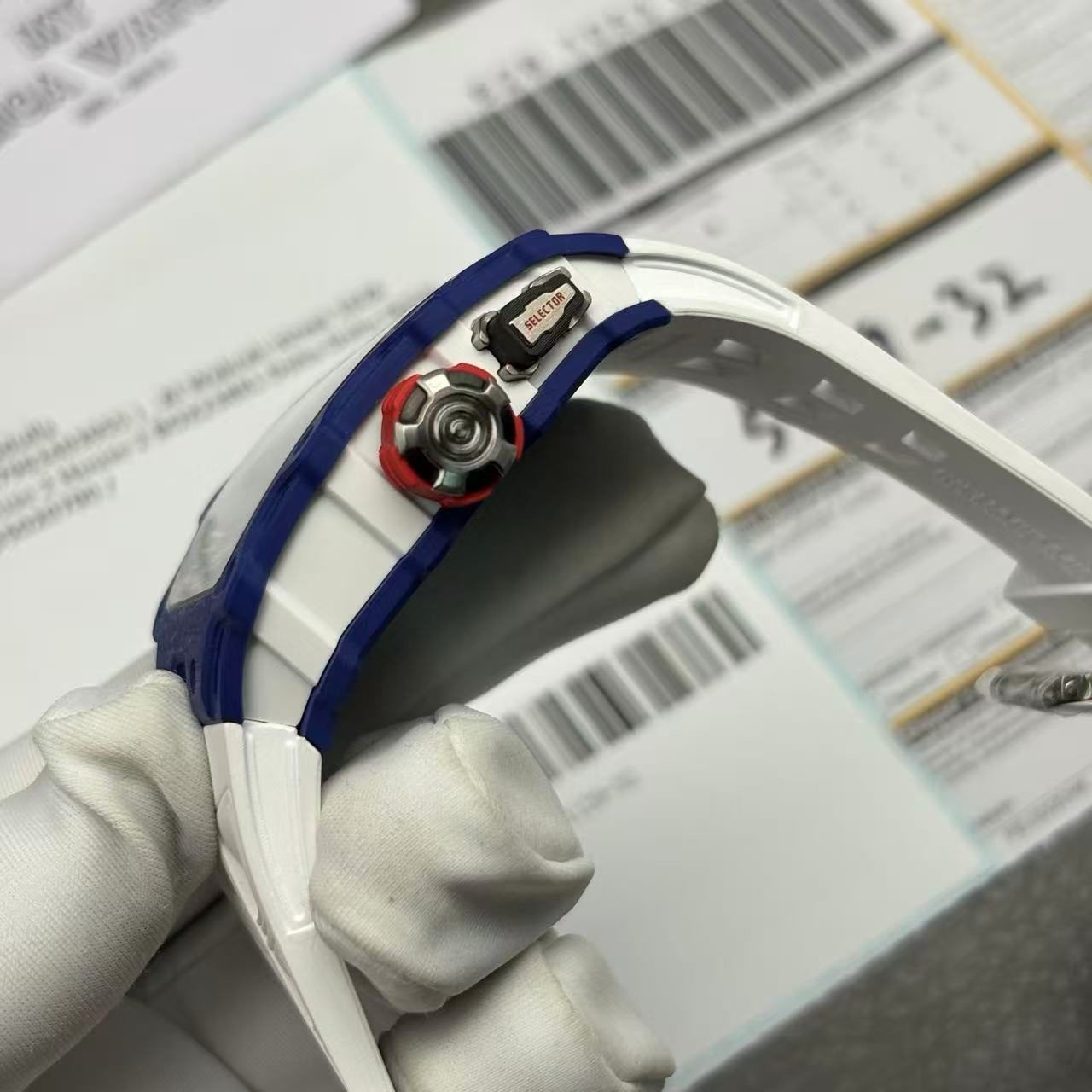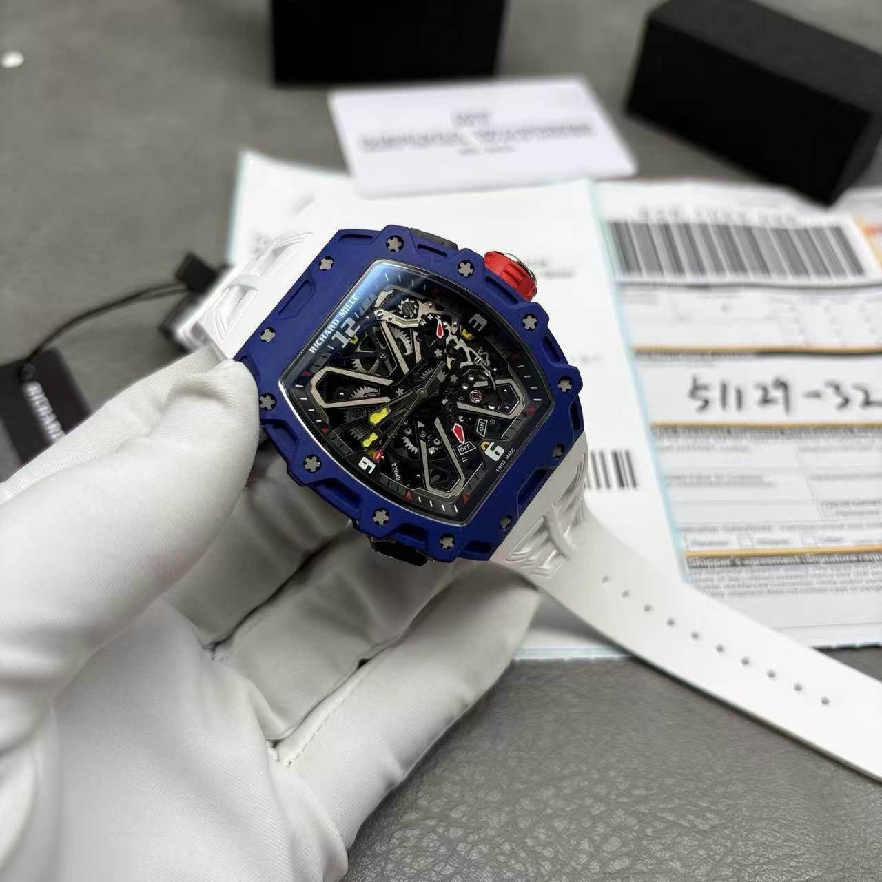 The striking white Quartz TPT bezel contrasts beautifully with the blue carbon fiber case, while the white rubber strap offers supreme comfort and durability. Sapphire crystal glass ensures scratch resistance and crystal-clear visibility, and the NTPT carbon fiber case back reinforces its technical strength. Designed for collectors and enthusiasts alike, this RM 35-03 replica merges sporty energy with refined craftsmanship, embodying the bold legacy of Rafael Nadal himself.
