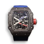 The Richard Mille RM67-02 King of High Jump Championship Model is an exquisite timepiece that showcases exceptional craftsmanship and innovation. Featuring a 1:1 precise mold opening, the case is meticulously crafted from 100% NTPT carbon fiber and ceramic material, creating a distinctive texture that is both durable and visually striking. This model is powered by an original Citizen fully automatic mechanical movement, operating at a precise frequency of 28,800 vibrations per hour. The watch’s dynamic design is highlighted by carefully scattered small pieces and unique lines, all demonstrating advanced technological sophistication. The 48x42mm case is complemented by a specially designed nylon strap, providing both comfort and style. This timepiece embodies the perfect blend of high-performance engineering and elegant aesthetics, making it a standout in the world of luxury watches.