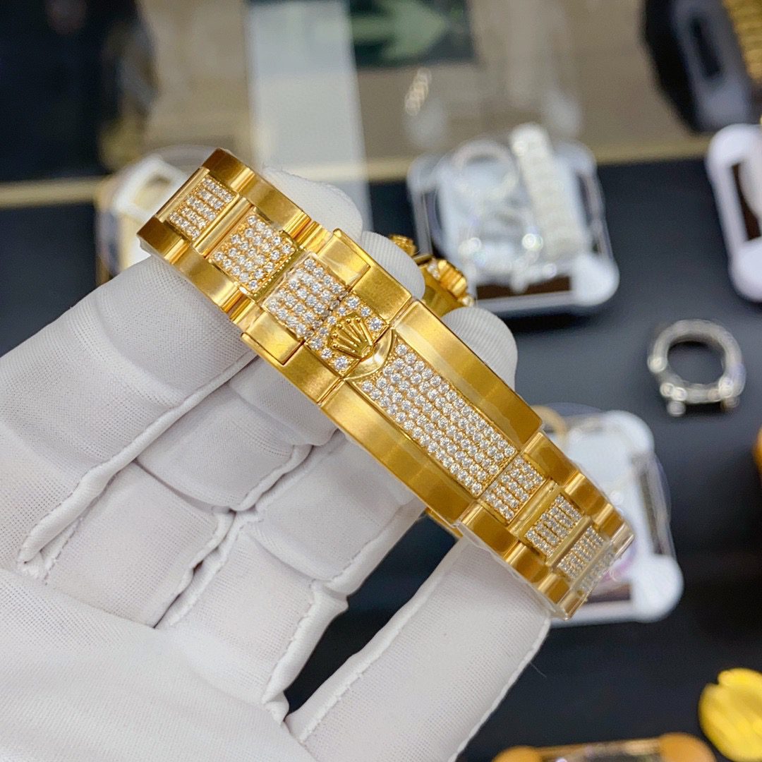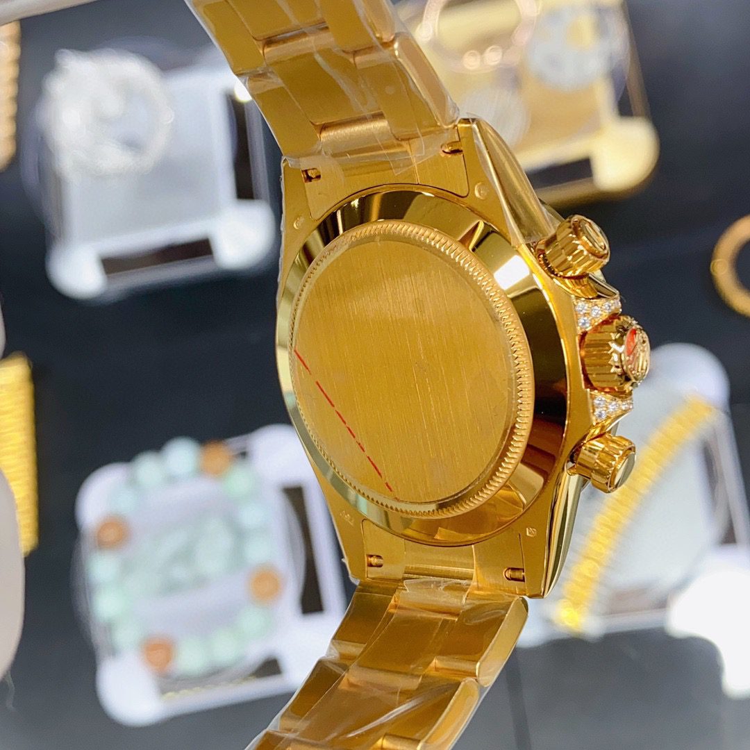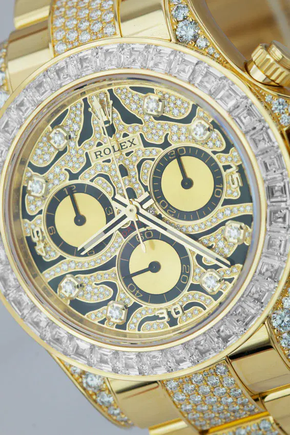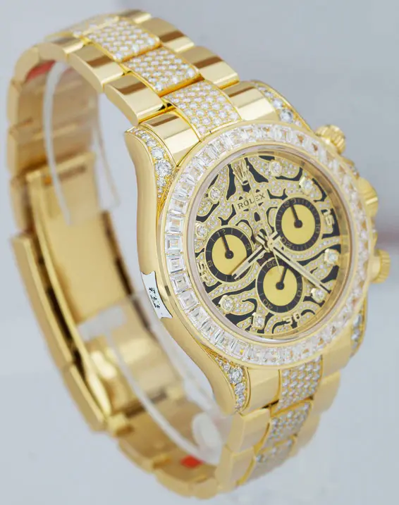 The watch features a yellow-gold–finished case paired with a diamond-set bezel, delivering an immediate sense of opulence. Its classic Daytona proportions remain intact, offering a confident and commanding wrist presence while preserving the iconic racing heritage of the Cosmograph line. Sapphire crystal protects the dial and enhances clarity from every angle.