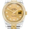 The Replica Rolex Datejust 116243 is a masterpiece of luxury and precision, blending timeless design with refined sophistication. This elegant 36mm model features a stainless steel and yellow gold-plated case beautifully set with diamonds, offering a striking presence that captures attention from every angle. The champagne dial, paired with gold-tone hands and diamond hour markers, exudes a warm radiance and classic appeal that defines the Datejust legacy.