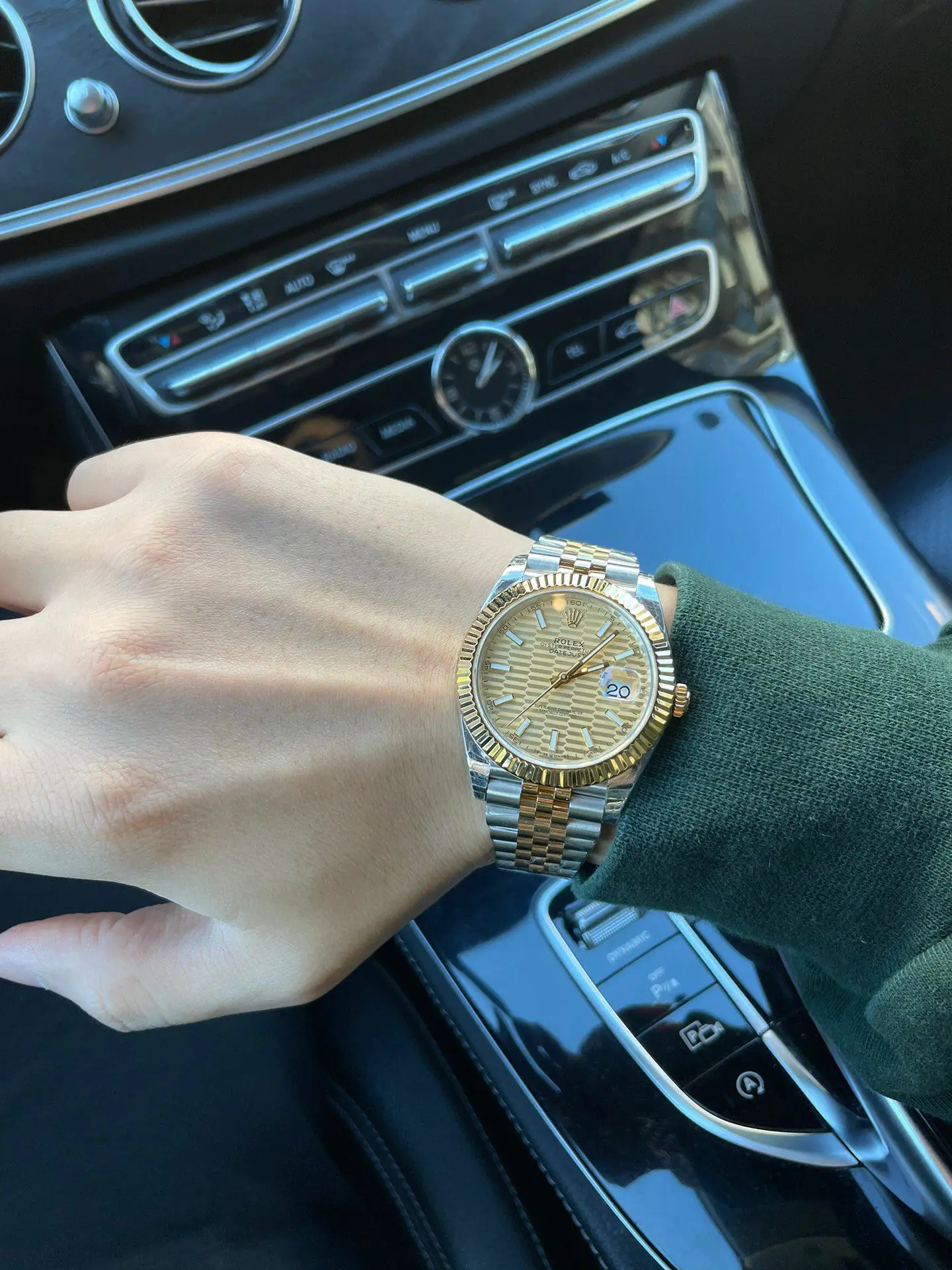 The 41mm Oyster-style case, inspired by stainless steel and yellow gold finishing, offers a bold yet balanced wrist profile. The iconic fluted bezel adds brilliance and depth, reflecting light beautifully while reinforcing the watch’s prestigious character. Protected by sapphire crystal, the watch delivers long-lasting clarity and durability.