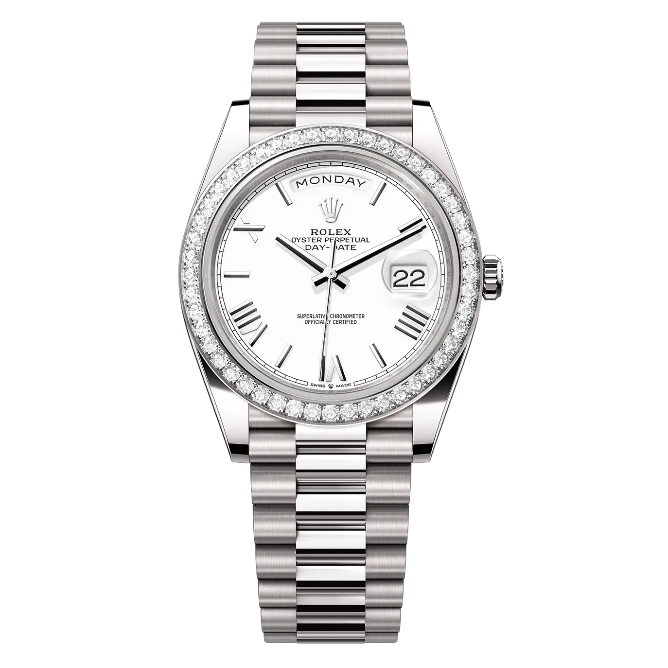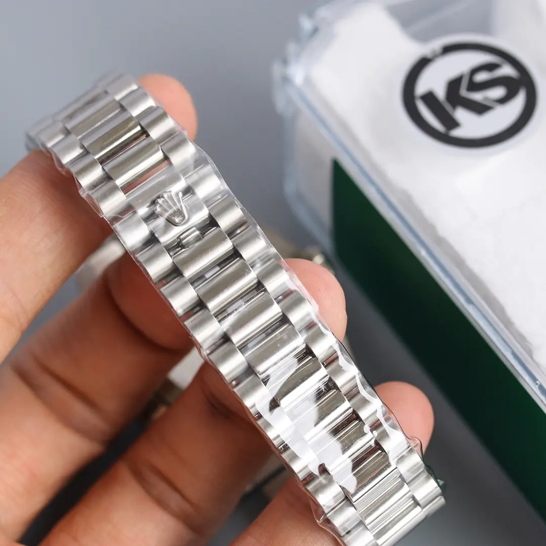 The 40mm case, finished in a sleek white-gold tone, offers a bold yet perfectly balanced wrist profile. Its smooth bezel and polished surfaces create a clean, contemporary aesthetic while preserving the classic Day-Date identity. A scratch-resistant sapphire crystal ensures clarity and durability for daily wear.