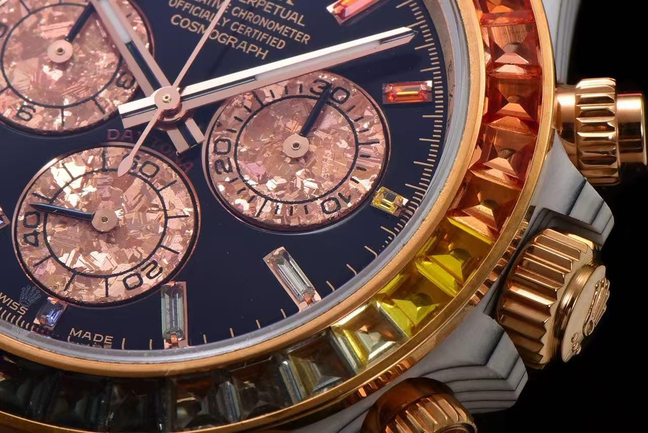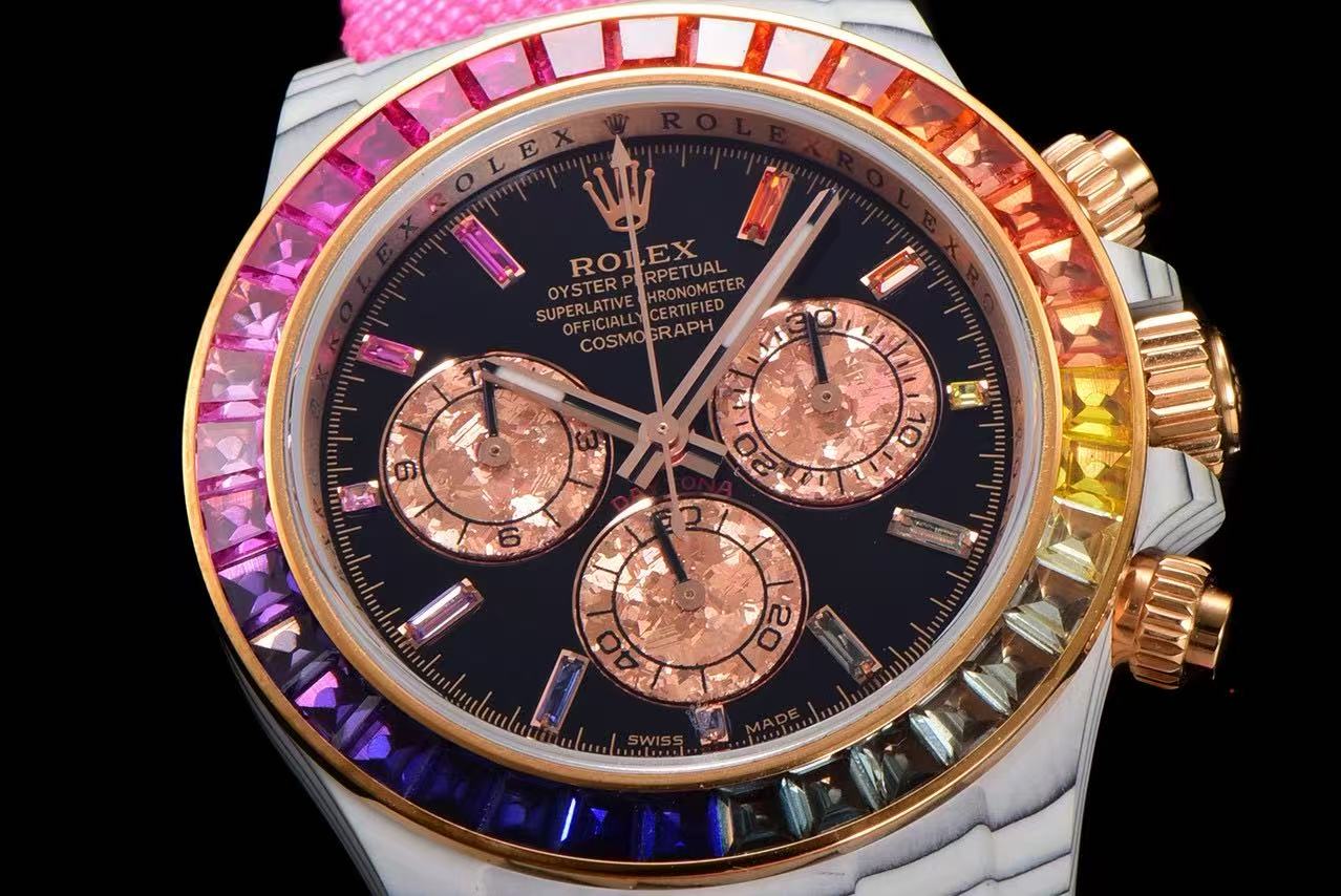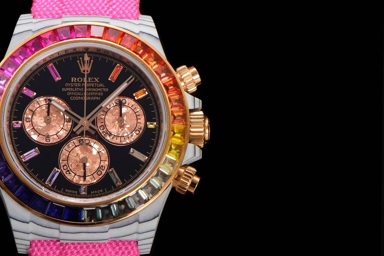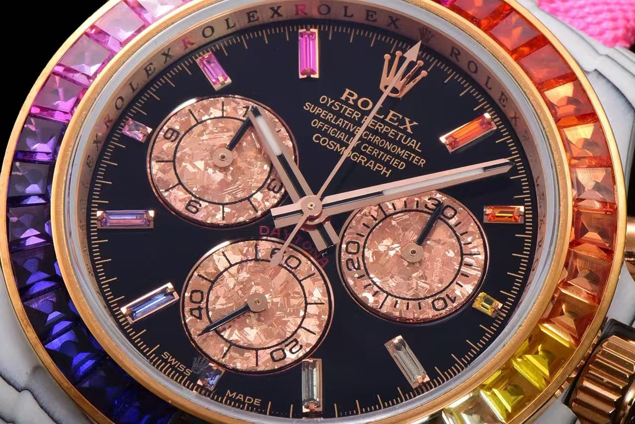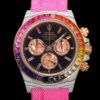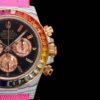 Limited Stock Alert: Only a few of this Replica Rolex Cosmograph Daytona Rainbow remain available. Restocking is uncertain due to the intricate gem-setting process, making each piece a true collector’s treasure.