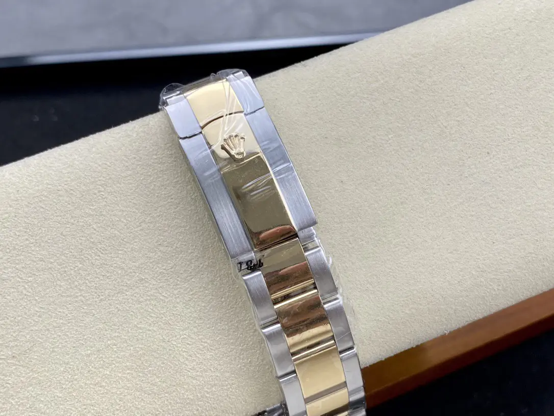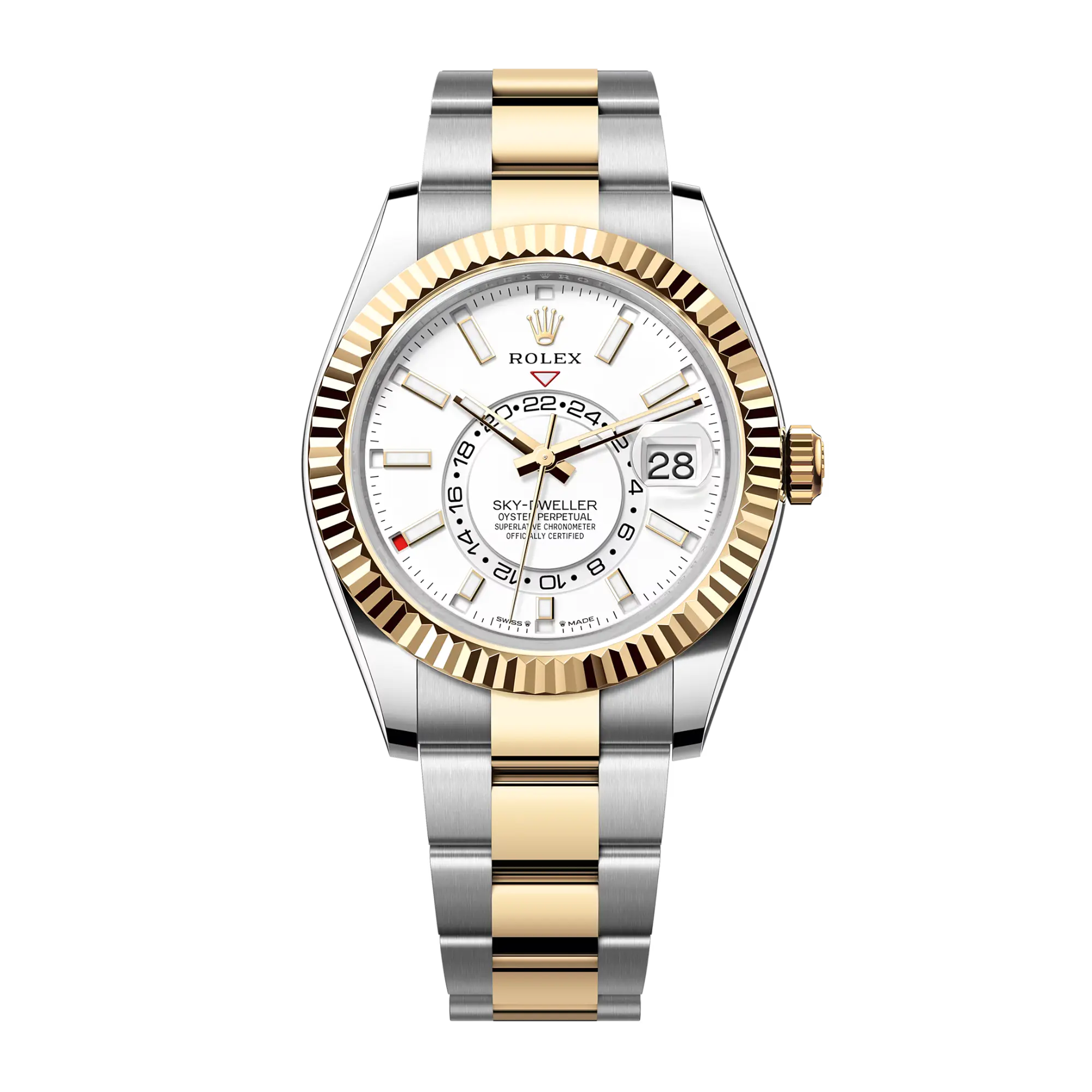 The 42mm Oyster case, finished in a yellow-gold and stainless-steel tone, offers a bold yet balanced profile on the wrist. Its robust construction, polished fluted bezel, and screw-down crown reflect the Sky-Dweller’s reputation for durability and sophistication. Sapphire crystal ensures long-lasting clarity and protection.